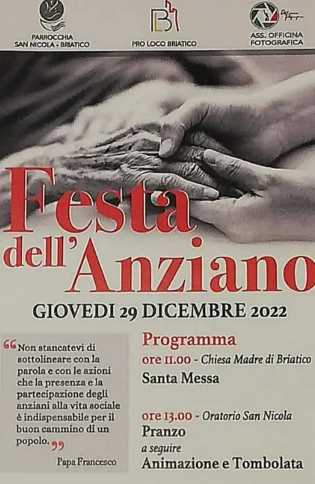 Una festa dedicata agli anziani della comunità. La parrocchia San Nicola di Briatico organizza con la collaborazione della Pro loco, di Officina fotografica e del centro giovanile ricreativo dell’oratorio la prima edizione della manifestazione dedicata alle categorie più fragili. Un’idea pensata per combattere la solitudine cui troppo spesso i nostri anziani sono costretti. Un isolamento acutizzato con l’arrivo della pandemia. Pertanto, la parrocchia punta a realizzare iniziative sociali in grado di coinvolgere le diverse fasce di cittadini. Protagoniste le comunità di Briatico e di Sciconi-Conidoni grazie all’impegno profuso dai parroci don Mino De Pascalis e don Andrea Campennì. Fondamentale, l’apporto delle associazioni e dei volontari con cui s’intende cementificare un rapporto di collaborazione per promuovere attività di servizio e supporto alle famiglie. In programma per il futuro, la realizzazione di un parco giochi inclusivo dove bimbi e anziani abbiano la possibilità di socializzare, godersi il verde, fare movimento.