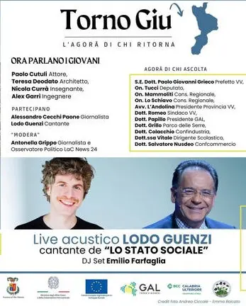 Un dibattito sul tema dello spopolamento del Sud con successivo concerto live, arricchito dalla presenza in platea di autorevoli ospiti, pronti ad ascoltare idee, proposte e criticità espresse da alcuni giovani professionisti che dopo un’esperienza lavorativa in nord Italia hanno deciso di far ritorno nella loro terra natia. Questo, e non solo, proporrà la terza edizione di “Torno Giù – l’agorà di chi ritorna”, evento organizzato annualmente dall’amministrazione comunale di Jonadi. L’appuntamento è per venerdì 6 settembre, a partire dalle 20.30, presso la delegazione municipale di località Aeroporto della frazione Vena. L’incontro sarà moderato da Antonella Grippo, giornalista e osservatore politico de LaC News24. Tra gli ospiti, il noto giornalista Alessandro Cecchi Paone e il cantante Lodo Guenzi, frontman del celebre gruppo musicale “Lo Stato Sociale” che, tra l‘altro, al termine del dibattito in sala delizierà i presenti con un concerto dal vivo con la partecipazione del Dj Set Emilio Farfaglia.