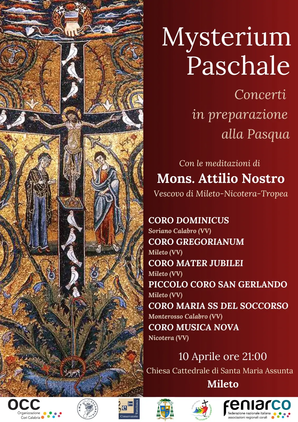 Prosegue la rassegna “Mysterium Paschale”, serie di eventi di musica sacra organizzati dall’OCC (Organizzazione Cori Calabria) sul territorio della diocesi di Mileto-Nicotera-Tropea, e non solo, in preparazione alla Pasqua. Nei giorni scorsi, tra l’altro, all’interno della chiesa “Maria Santissima degli Angeli” di Vibo Valentia si è svolto il riuscito concerto spirituale per coro, organo e voce recitante “Via crucis via lucis”, diretto dal maestro Romolo Calandruccio. Insieme a lui – nella proposizione di musiche di Macrì, Mozart ed Hendel – coinvolti il coro polifonico “Musica nova” di Nicotera, l’organista Donato Arcuri e l’attrice Dolores Mazzeo. Oggi 10 aprile, invece, “Mysterium Paschale” proporrà a Mileto l’esibizione dei cori “Dominicus” di Soriano Calabro, “Maria Santissima del Soccorso” di Monterosso Calabro, “Musica nova” di Nicotera e “Gregorianum”, “Mater Giubilei” e “San Gerlando” della città ospitante. Il concerto di musica sacra si svolgerà, a partire dalle ore 21, nella splendida cornice della basilica cattedrale “Santa Maria Assunta-San Nicola”, tra le imponenti navate della chiesa madre della diocesi di Mileto-Nicotera-Tropea. Ad arricchire il tutto, le riflessioni sul senso del mistero pasquale del vescovo della diocesi, monsignor Attilio Nostro. La rassegna “Mysterium Paschale” viene organizzata in collaborazione con l’episcopato miletese, l’Ama Calabria, il Conservatorio di Musica “Torrefranca” di Vibo Valentia e la Feniarco. Essa, come detto, sta proponendo in diverse località calabresi una variegata serie di concerti, con l’obiettivo dichiarato di unire il fascino della musica sacra alla meditazione sulle fondamenta della Pasqua, su cui tra l’altro poggia il cristianesimo: il mistero della passione, morte e resurrezione del Nazzareno.
