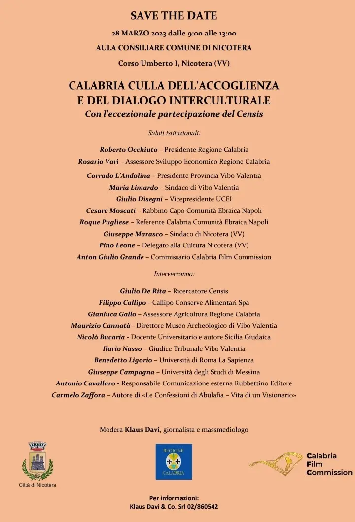 “Calabria culla dell’accoglienza e del dialogo interculturale”. È questo il titolo del convegno che si terrà a Nicotera il prossimo 28 marzo, sotto la regia del giornalista e massmediologo Klaus Davi. Terza tappa del progetto Jewis Calabria, l’appuntamento è a partire dalle ore 9.30 nella sala consiliare comunale del cinquecentesco Palazzo Convento. Annunciata la presenza di Roberto Occhiuto, presidente della Regione Calabria; Rosario Varì, assessore allo regionale allo Sviluppo economico; Corrado L’Andolina, presidente della Provincia di Vibo Valentia; Giulio Disegni, vice presidente Unione comunità ebraiche italiane (Ucei); Maria Limardo, sindaco di Vibo Valentia; Cesare Moscati, rabbino capo della Comunità ebraica di Napoli; Roque Pugliese, referente per la Calabria della Comunità ebraica di Napoli; Giuseppe Marasco, sindaco di Nicotera; Pino Leone, consigliere comunale con delega alla cultura del Comune di Nicotera e Anton Giulio Grande, commissario di Calabria Film Commission. Ad animare il dibattito con i loro interventi saranno invece, nell’ordine, Giulio De Rita, ricercatore Censis; Filippo Callipo, imprenditore e presidente della Callipo Conserve alimentari Spa; Gianluca Gallo, assessore regionale all’Agricoltura; Maurizio Cannatà, direttore del Museo archeologico di Vibo Valentia; Nicolò Bucaria, docente universitario e autore del libro “Sicilia Giudaica”; Ilario Nasso, giudice del Tribunale di Vibo Valentia; Benedetto Ligorio, docente dell’Università La Sapienza di Roma; Giuseppe Campagna, docente dell’Università degli studi di Messina; Carmelo Zaffora, autore di “Le confessioni di Abulafia – Vita di un visionario” e il responsabile della comunicazione esterna della casa editrice Rubettino, Antonio Cavallaro. [Continua in basso]