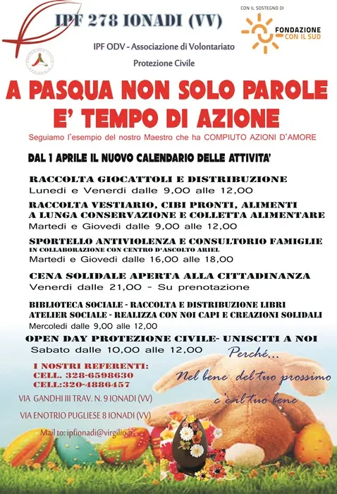 L’Istituto per la Famiglia 278 di Ionadi presenta il calendario delle attività pasquali che saranno realizzate a partire da oggi 1 aprile in seno al progetto Lumina sostenuto da Fondazione con il Sud con il Bando Volontariato 2021. «Non possiamo prescindere dall’insegnamento cristiano del nostro Maestro che ci ha mostrato il suo amore con azioni concrete ed eterne – ricorda il presidente Luigi Leone -. Per questo la nostra azione quotidiana ormai ben conosciuta nel territorio non si ferma anzi si arricchisce di nuove attività». Oltre alle consuete opere sociali quali la raccolta alimentare, di vestiario, cibi pronti, si è deciso di introdurre la distribuzione di giocattoli e libri per i minori e la mensa sociale serale del venerdì per creare nuovi momenti di condivisione ed aiuto. [Continua in basso]