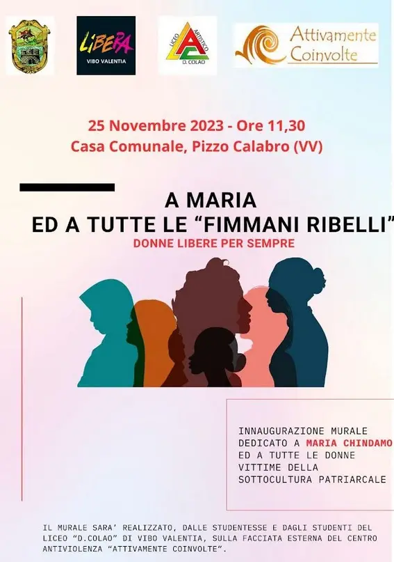 Da inizio anno sono 106 le donne uccise in Italia, più della metà per opera del partner o dell’ex. Numeri che preoccupano ancora di più se sommati a tutte le violenze fisiche e psicologiche subite ogni giorno. Ma, soprattutto, dietro i numeri ci sono storie, sentimenti, volti. Abbiamo scelto il volto di Maria perché è una donna della nostra terra, un’imprenditrice libera e coraggiosa. È stata uccisa perché la libertà di una donna non è tollerata in un sistema pervaso da una mentalità patriarcale e ‘ndranghetista. È stata uccisa perché per loro una donna non è libera di amare e di vivere. Maria è una delle tante fimmani ribelli calabresi. Molte donne che si sono ribellate oggi vivono in sicurezza e circondate dai propri cari. Tante altre ancora subiscono violenza quotidianamente. Per questo è fondamentale la presenza di sportelli antiviolenza come quello di Attivamente Coinvolte, luoghi sicuri in cui una donna può trovare aiuto e rifugio. Il murale sarà disegnato dalle studentesse e dagli studenti del corso serale del Liceo Artistico Colao. All’inaugurazione sarà presente anche il fratello dell’imprenditrice uccisa nel 2016, Vincenzo Chindamo.