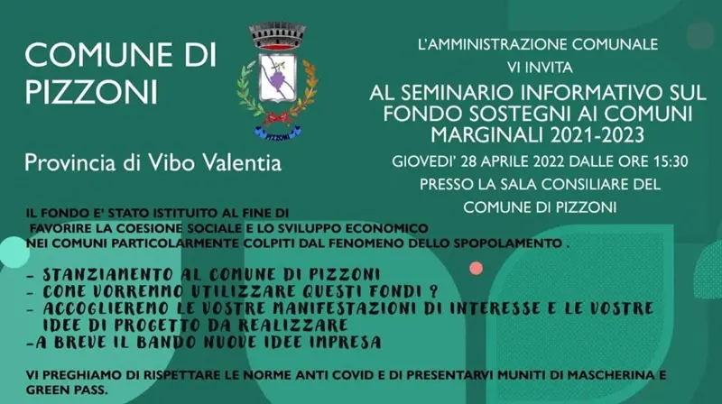 L’amministrazione comunale di Pizzoni, guidata dal sindaco Vincenzo Caruso, ha organizzato un seminario informativo sul fondo sostegni ai Comuni marginali per il biennio 2021-2023. L’evento si è tenuto ieri pomeriggio alle ore 15:30 nella sala consiliare del Comune. Come riferito dall’amministrazione, il fondo è stato istituito al fine di favorire la coesione sociale e lo sviluppo economico nei comuni particolarmente colpiti dal fenomeno dello spopolamento. Ecco perché, durante il seminario, si è dibattuto sullo stanziamento al Comune di Pizzoni e su come saranno utilizzati tali fondi. Non solo: il Comune ha anche accolto le manifestazioni di interesse e le idee sul progetto da realizzare da parte di tutti coloro che hanno partecipato, con la promessa che a breve sarà reso pubblico il bando con le nuove idee di impresa.