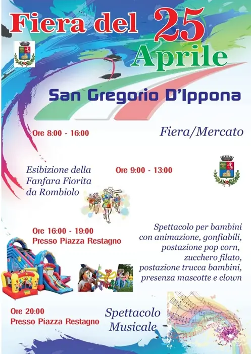 Torna a San Gregorio d’Ippona la fiera del 25 aprile. Un appuntamento tanto atteso dopo le restrizioni imposte dalla pandemia. Dalle otto di mattina si aprirà la fiera, ma ci sarà spazio anche alla musica e alle attività per bambini. Per tutta la mattinata, si esibirà la fanfara Fiorita di Rombiolo, mentre alle 20 in piazza Restagno è previsto uno spettacolo musicale. Nel pomeriggio, dalle ore 16 ci saranno animazioni e laboratori per bambini. [Continua in basso]