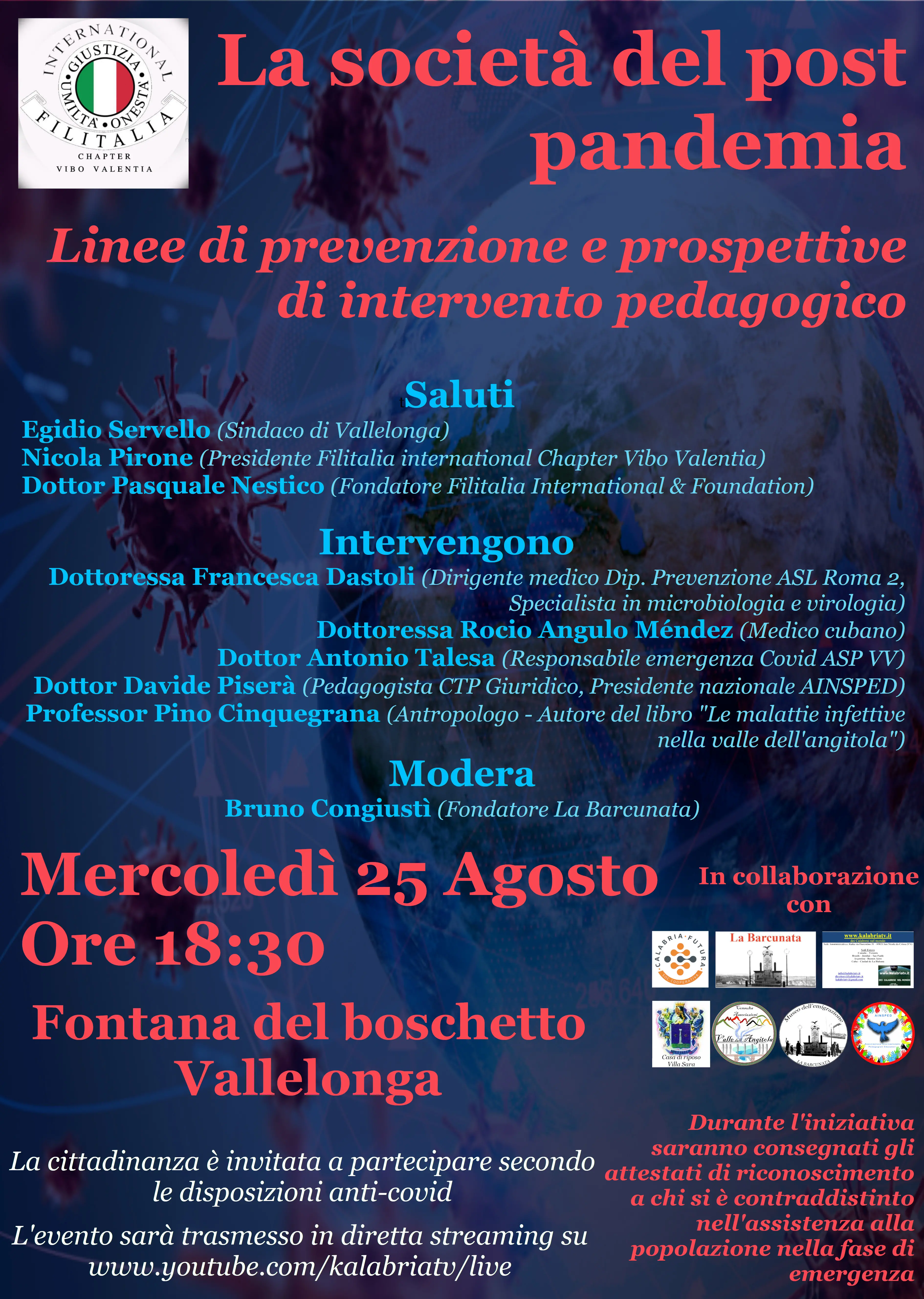 L’iniziativa sarà aperta dai saluti del primo cittadino di Vallelonga Egidio Servello, del presidente del chapter di Vibo Valentia della Filitalia International Nicola Pirone e dal professor Pasquale Nestico, cardiologo e fondatore della Filitalia. Durante l’iniziativa saranno consegnati gli attestati a chi si è impegnato per dare assistenza alle popolazioni colpite dal coronavirus. L’evento sarà visibile in diretta streaming su youtube.com/kalabriatv/live.