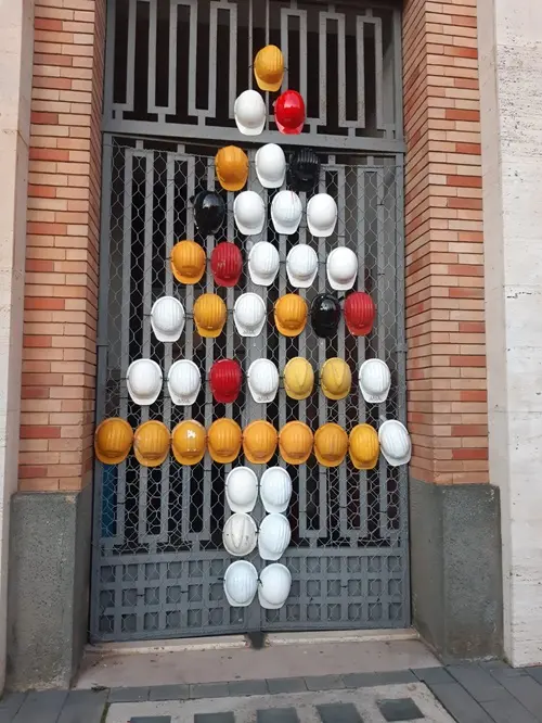 A Vibo Valentia l’albero fatto con i caschi da lavoro è stato allestito sulla facciata del municipio, a lato dell’ingresso principale.