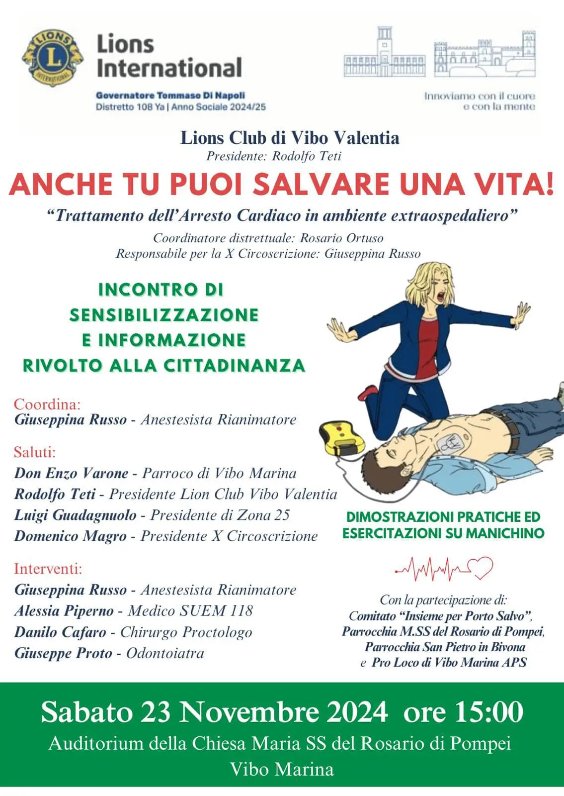 A seguito dell’istallazione del defibrillatore alla Farmacia Costa Degli Dei di Porto Salvo, resa possibile grazie all’impegno del Comitato “Insieme per Porto Salvo”, dalle numerose aziende collocate sul territorio e dall’intera comunità, posto sotto la supervisione del dottor Giuseppe Vazzana, il 23 novembre 2024, alle ore 15, all’Auditorium della Chiesa Maria SS del Rosario di Pompei a Vibo Marina si terrà un corso di primo soccorso gratuito e rivolto a tutta la cittadinanza. È quanto comunica attraverso un post Facebook l’attivista Ilenia Iannello che ci tiene a ringraziare la dottoressa Giusi Russo e il Lions Club Vibo Valentia «per averlo reso possibile».