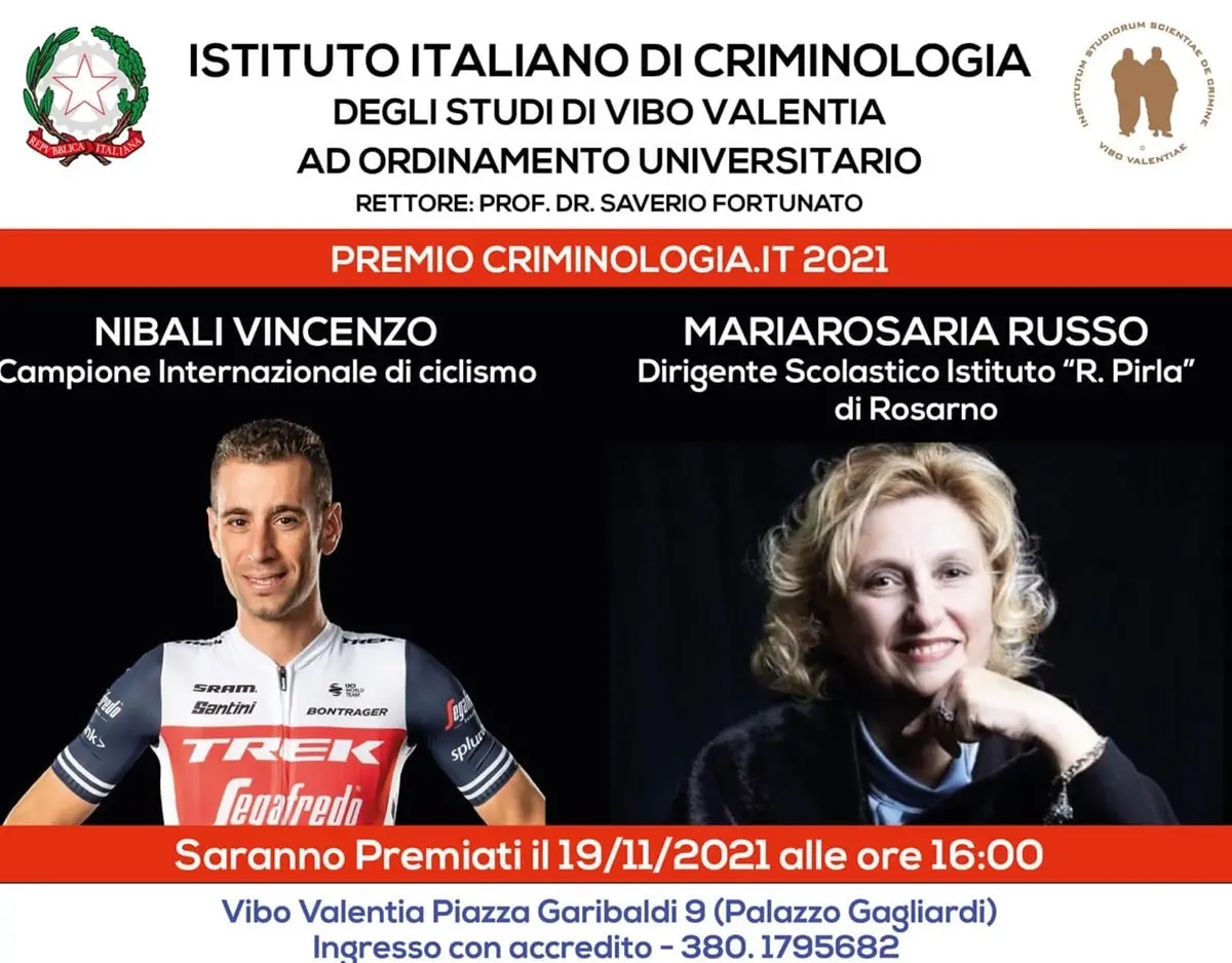 Nibali e la Russo saranno rispettivamente premiati dal Camillo Falvo, procuratore capo della Procura della Repubblica di Vibo Valentia, e da Maria Limardo, sindaco di Vibo Valentia. La cerimonia si svolgerà domani, venerdì 19 novembre, alle ore 16, presso la l’aula magna dell’Istituto a Palazzo Gagliardi.