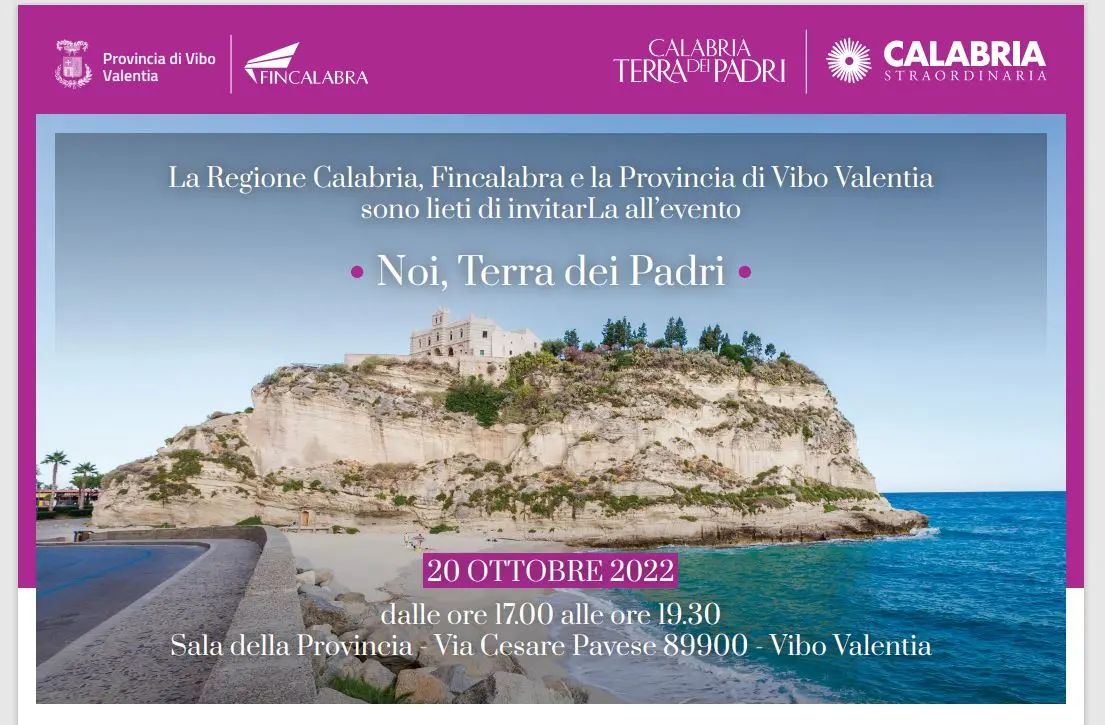 «Internazionalizzare il sistema produttivo regionale e incrementare le presenze turistiche legate al turismo di ritorno, il cosiddetto turismo delle radici, un potenziale bacino di milioni di calabresi all’estero – in particolare le nuove generazioni – da invogliare a compiere un vero e proprio viaggio in Calabria, nella Terra dei Padri, alla scoperta delle proprie radici». Questo l’obiettivo del progetto denominato “Calabria, terra dei padri”, un intervento di marketing territoriale, promosso dalla Regione Calabria e gestito da Fincalabra, che giovedì prossimo, 20 ottobre, alle ore 17, verrà presentato ai cittadini, agli amministratori e agli attori territoriali del Vibonese nella sala consiliare della Provincia di Vibo Valentia. [Continua in basso]