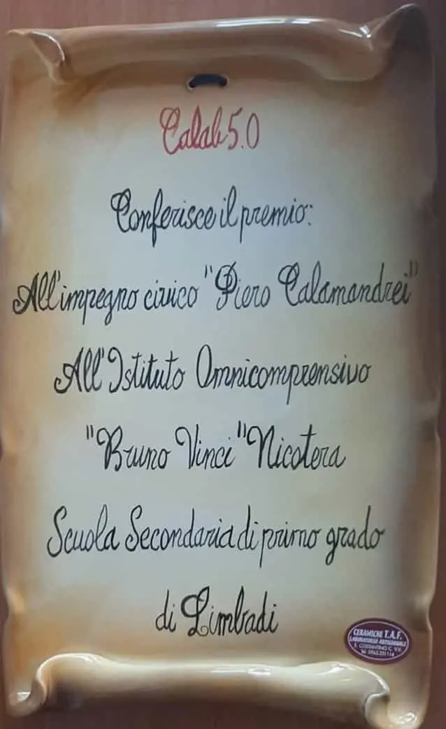 «Un premio per rendere merito a chi, con azioni concrete, dimostra che un’altra Calabria è possibile». I giovani dell’organizzazione CaLab 5.0 descrivono così il premio all’impegno civico “Piero Calamandrei”, da loro ideato e conferito quest’anno – alla sua prima edizione – alla scuola secondaria di primo grado di Limbadi. Merito di alunni ed insegnanti limbadesi è quello di aver portato avanti il progetto “Leggere contro le mafie”. Un percorso, quest’ultimo, promosso dall’associazione San Benedetto Abate con la collaborazione di Libera Vibo Valentia ed il contributo dell’amministrazione comunale di Limbadi. Nell’ambito del progetto, i ragazzi hanno letto il libro “Al posto sbagliato. Storie di bambini vittime di mafia” di Bruno Palermo e hanno provato a immaginare – e a ricostruire tramite un video da loro realizzato – come sarebbero continuate le vite di Nicholas Green, Rita Atria e Gianluca Canonico se non avessero incontrato la mafia.