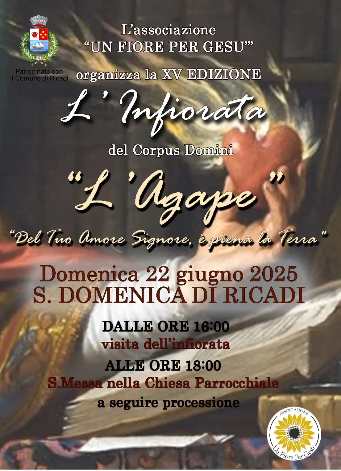 «Il tema che abbiamo scelto – spiegano dall’associazione – è “L’Agape – Del tuo amore Signore, è piena la terra”. Una frase, questa, che è un inno per tutti e che è legata e dedicata alla presenza divina e concreta dell’amore di Cristo, quell’amore che si manifesta in ogni dono del creato, nelle persone e nei gesti quotidiani. I petali colorati si faranno preghiera visiva, trasformando le strade in un tappeto di bellezza e spiritualità. Siamo convinti più che mai che l’amore di Dio non è astratto o lontano, ma è presente in ogni angolo della creazione, nelle azioni di cura e di compassione. L’infiorata, in tal senso, diventa il segno visibile di un amore che fiorisce nella nostra terra e nei nostri cuori. In un mondo che spesso perde di vista la speranza, l’amicizia e il perdono, vogliamo proclamare con l’arte che la terra ha bisogno di Gesù e del suo amore, credendo fortemente che anche noi possiamo esserne strumenti nelle sue mani».