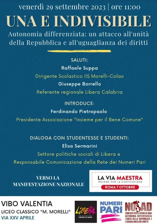 Si parte giovedì 28 settembre alle ore 17:30 presso la Sala Concerti del comune di Catanzaro, per proseguire venerdì 29 settembre alle ore 17:00 nella Sala Margherita del centro storico di Crotone. Ma anche momenti di confronto e dialogo con le studentesse e gli studenti del Liceo Classico “M. Morelli” di Vibo Valentia, venerdì 29 settembre alle ore 11:00, e presso l’Istituto “Erodoto di Thurii” di Cassano All’Ionio, alle ore 10:30 di sabato 30 settembre. «Passi importanti di consapevolezza e responsabilità verso la mobilitazione generale del 7 ottobre in difesa, ancora una volta, della nostra Costituzione sicuramente la più bella, ma di certo la più disattesa ed inapplicata», chiosa Libera Calabria.