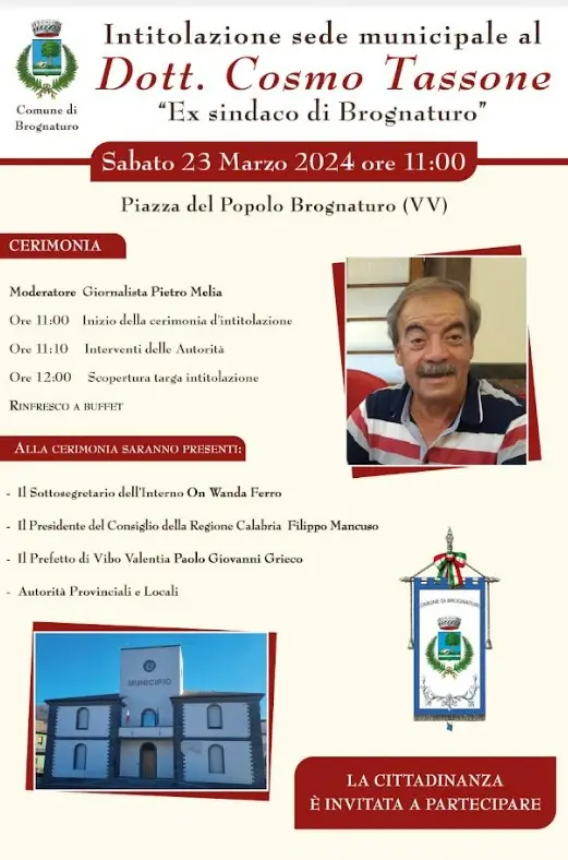 Sarà intitolata a Cosmo Tassone, ex sindaco, la sede municipale del Comune di Brognaturo. A ufficializzarlo, l’amministrazione guidata dal primo cittadino Rossana Tassone. L’intitolazione ha ottenuto il via libera della Prefettura di Vibo Valentia. L’iniziativa intende onorare la memoria di «una figura di rilievo nella storia politica della comunità brognaturese e dell’intero territorio. Cosmo Tassone noto come ” lu cicchinu” – scrive la compagine amministrativa – ha dedicato la sua vita al servizio dei suoi cittadini e dell’intero territorio». La cerimonia si terrà sabato 23 Marzo alle ore 11:00 in Piazza del Popolo a Brognaturo e vedrà la partecipazione di autorità civili, militari e religiose tra cui il sottosegretario dell’interno Wanda Ferro; il presidente della regione Filippo Mancuso; il prefetto di Vibo Valentia Paolo Grieco. Il sindaco e l’amministrazione comunale invitano tutti i cittadini a partecipare considerato l’importante contributo dato.