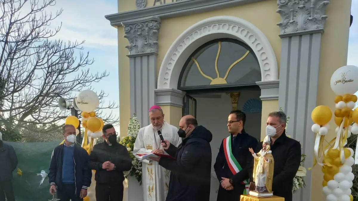 La cerimonia inaugurale si è tenuta alla presenza del vescovo, monsignor Attilio Nostro, del parroco don Andrea Campennì, del primo cittadino Francesco Mazzeo. Gioia incontenibile da parte della comunità, tradizionalmente legata alla cappelletta e alla devozione verso San Basilio. Canti e preghiere hanno scandito il ritorno della statua del Santo nella sua storica sede. Il sindaco Francesco Mazzeo ha brevemente commentato: «Si chiude, finalmente, con un lieto fine, quella brutta situazione che aveva visto la vecchia edicola sacra intitolata a San Basilio, prima lesionata e poi definitivamente demolita a causa di un incidente stradale. La fedele ricostruzione – ha specificato il sindaco – era un atto dovuto nei confronti e per rispetto alla memoria di tutti quei cessanitesi che, spinti da una forte devozione, tanti anni fa hanno deciso di costruire, in quel punto, la vecchia chiesetta. La sinergia tra Comune, Provincia e Curia, coordinati in maniera eccellente da don Andrea, ha fatto il resto». [Continua in basso]