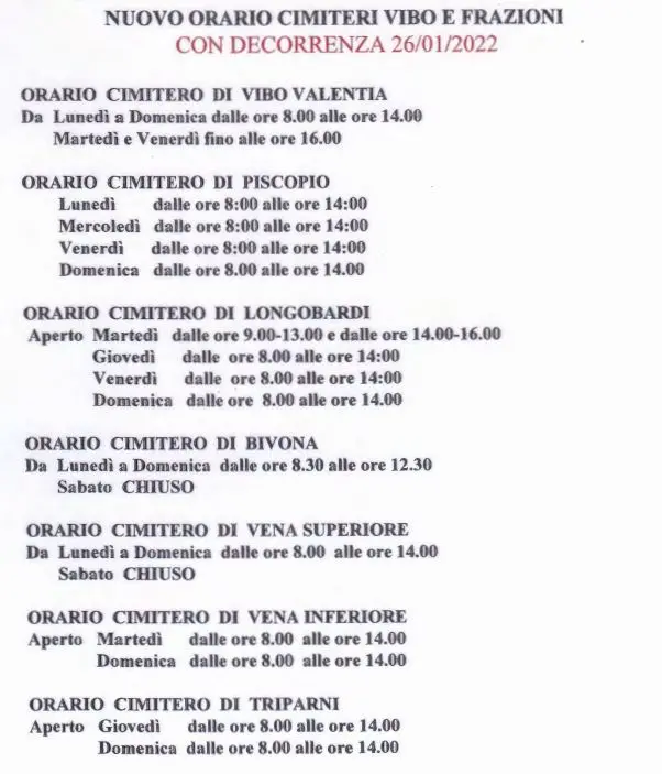 Nuovi orari di apertura per i sette cimiteri presenti sul territorio comunale di Vibo Valentia, in vigore a partire da oggi 26 gennaio 2022. Il provvedimento è firmato dalla dirigente Adriana Teti e riguarda i cimiteri di Vibo e frazioni (Piscopio, Longobardi, Bivona, Vena Superiore, Vena Inferiore e Triparni). Solo nella città capoluogo è prevista l’apertura tutti i giorni della settimana. Quasi ovunque previste esclusivamente aperture mattutine. Di seguito gli orari completi.