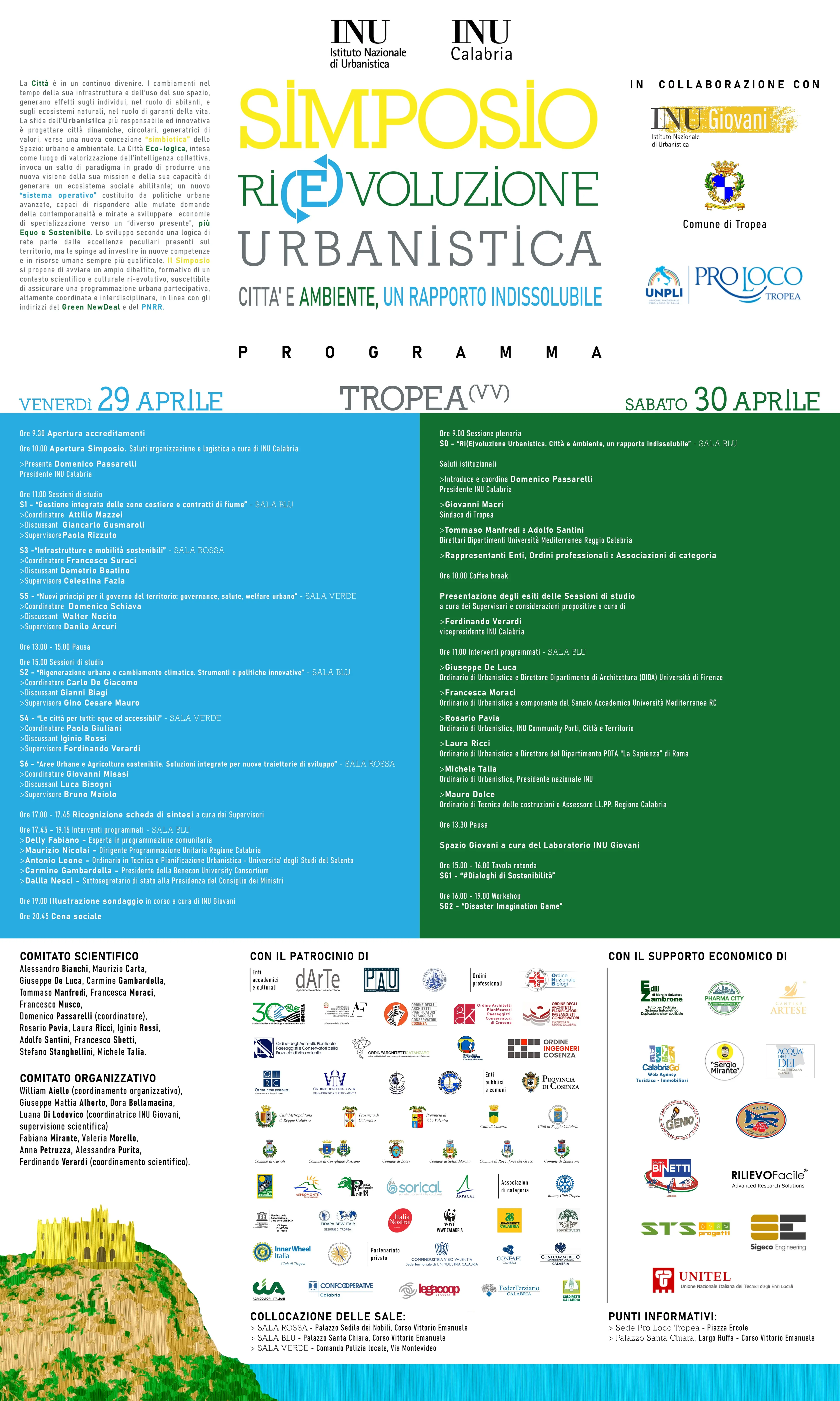 Gli scambi tecnico-scientifici del 29 aprile saranno tenuti da diversi esperti nazionali, rappresentanti delle istituzioni locali e del partenariato pubblico-privato, e spaziano su sei temi riguardanti la gestione integrata delle coste e dei fiumi, la mobilità e trasporto sostenibile, la rigenerazione urbana e accessibilità inclusiva delle città, i nuovi principi per il governo del territorio e le soluzioni integrate per l’agricoltura sostenibile; concludendosi, nella mattina del 30 aprile con una seduta plenaria, i cui atti saranno oggetto di una futura pubblicazione scientifica. Il pomeriggio sarà dedicato allo spazio Giovani, su cui Inu Calabria ha inteso dare grande rilevanza; inizierà con una tavola rotonda riguardante temi di Sostenibilità e a seguire il “Disaster Game”, i ragazzi-giocatori saranno chiamati a destreggiarsi tra vari scenari contraddistinti da un caratteristico disastro naturale. Il gioco consiste nel dotare la propria comunità delle opportune misure di prevenzione e sicurezza; sensibilizzare ad una resa resiliente; offrire strategie finalizzati ad affrontare certe particolari condizioni. Partner dell’evento sono il Comune di Tropea “Borgo dei Borghi 2021”, i dipartimenti DArte e Pau dell’Università Mediterranea, e circa 60 patrocini tra enti accademici, culturali e locali, nonché enti pubblici e comuni e associazioni di categoria e vari partner. Ringraziamenti giunti all’indirizzo del sindaco Macrì e agli sponsor che hanno supportato economicamente l’iniziativa.