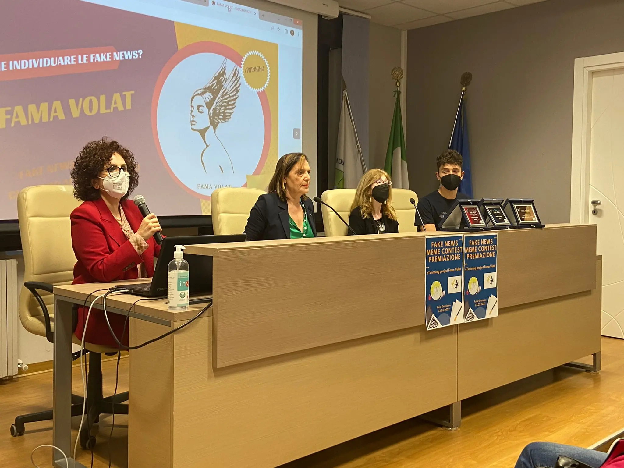 Nella sede del liceo scientifico “Berto” di Vibo Valentia ha avuto luogo la cerimonia di premiazione del “The Fake News Meme Contest”, promosso dalla classe IV B indirizzo ordinario e coordinata dai docenti Campanella, Cugliari e Fratini, nell’ambito del progetto ETwinning “Fama Volat”, realizzato in collaborazione con due scuole spagnole, una scuola francese e una italiana. In apertura della manifestazione la dirigente scolastica Caterina Calabrese ha portato i suoi saluti ai docenti ed agli studenti presenti, plaudendo all’iniziativa, all’interno di una collaborazione europea a cui il liceo “Berto” non è nuovo: da anni ormai è riconosciuta quale scuola eTwinning sul territorio calabrese (“eTwinning” è una comunità di scuole europee, che promuove l’uso delle nuove tecnologie e fornisce supporto, strumenti e servizi alle scuole) e si è più volte aggiudicata ambitissimi premi e riconoscimenti. Dopo i saluti di rito da parte della professoressa Campanella, che ha ringraziato la dirigente scolastica per la sua disponibilità ad accogliere idee e proposte progettuali, a presentare il loro lavoro sono stati gli stessi ragazzi coinvolti. In relazione al tema eTwinning dell’anno “Alfabetizzazione mediatica e disinformazione”, gli studenti hanno approfondito le dinamiche di diffusione delle notizie false in Grecia, a Roma e in altri paesi europei, per poi stabilire somiglianze e differenze con il mondo di oggi, in cui la notizia viaggia velocemente soprattutto attraverso il web. [Continua in basso]