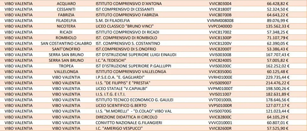 Il 51% dei fondi è destinato al Sud. Per la Calabria vi sono sul piatto 25 milioni e mezzo di euro, per interventi in 227 scuole. Tra queste, 23 sono della provincia di Vibo Valentia. Dagli oltre 200mila euro concessi agli istituti superiori di Vibo “Gagliardi” e “De Filippis – Prestia”, fino ai poco più di 50mila che andranno a Cessaniti e Sant’Onofrio, a tutti andranno ingenti risorse per la realizzazione di progetti finalizzati al miglioramento dell’inclusione e al contrasto dell’abbandono scolastico. «Prenderemo per mano le ragazze e i ragazzi che hanno difficoltà nella prosecuzione del loro percorso di studi e per questo rischiano di lasciare precocemente o, purtroppo, lo fanno. Saremo al fianco delle scuole lungo tutto il percorso», ha detto il ministro Bianchi nell’annunciare la misura. Ecco, nello specifico, le scuole vibonesi che beneficeranno dei fondi Pnrr in questione:
