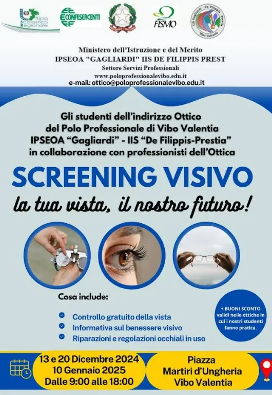 Tre giornate dedicate alla misurazione della vista. Ad annunciare l’appuntamento, gratuito per tutti i partecipanti, la Confesercenti in collaborazione con il Polo professionale di Vibo Valentia Ipseoa “Gagliardi”- Iis”De Filippis-Prestia” indirizzo Ottico ed i professionisti dell’ottica. Gli appuntamenti si terranno il 13 e il 20 dicembre 2024, e il 20 gennaio 2025.