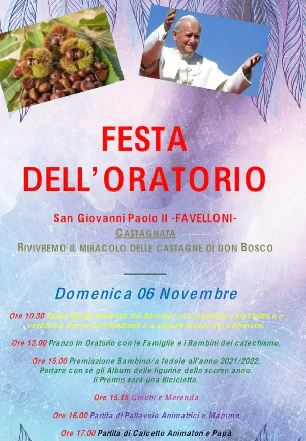Tra gli appuntamenti in programma, la festa dell’oratorio che si terrà il prossimo 6 novembre. Alle ore 10.30 è prevista una messa animata dai bambini con mandato catechistico. Si terrà la vestizione dei nuovi ministranti e a seguire il lancio dei palloncini. Alle 13.00 pranzo in oratorio con le famiglie e i bambini del catechismo. Alle 15.00 la premiazione del bambino/a fedele all’anno 2021/2022. Il premio sarà una bicicletta. Il pomeriggio sarà invece dedicato ai giochi e alla merenda. Alle 16.00, partita di pallavolo tra animatrici e mamme. Alle ore 17.00 partita di calcetto e sfida tra animatori e papà. Durante la giornata ci sarà anche la “castagnata”, un momento di condivisione e convivialità per rivivere il miracolo delle castagne di don Bosco.
