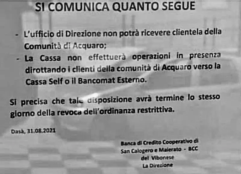 Il tutto allo scopo di garantire la salute della stragrande maggioranza dei nostri concittadini che, proprio grazie alle necessarie misure di salvaguardia sanitaria adottate, hanno potuto continuare e continuano a svolgere le normali attività della loro vita quotidiana e lavorativa. Appare quindi assolutamente discriminatorio l’atteggiamento dei vertici della Bcc del Vibonese e nella fattispecie della filiale di Dasà. Quale gesto riparatorio – afferma Barilaro – pretendiamo la rimozione immediata dell’avviso unitamente alle loro scuse per le decisioni assunte in quanto altamente offensive ed irriguardose. Riservandoci altresì la possibilità di adire tutte le vie che riterremo opportune per tutelare ulteriormente ed in modo inequivocabile la dignità calpestata di un’intera comunità”.