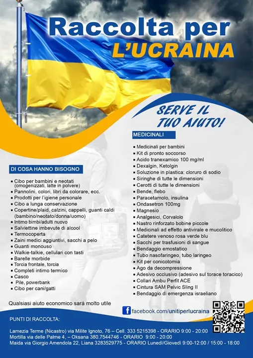 Per contribuire alla raccolta di beni di prima necessità basta andare sulla pagina Facebook.com/unitiperlucraina. I punti di raccolta sono a: Lamezia Terme (Nicastro) in via Milite Ignoto, 76; Gizzeria, frazione Mortilla, via delle Palme, 4; Maida in via Giorgio Amendola, 22; Vibo Marina in Corso Michele Bianchi, 2.