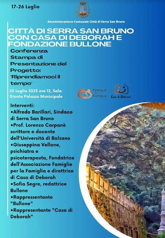 La città di Serra San Bruno ospiterà anche quest’anno i ragazzi di “Casa Di Deborah” dell’associazione Onlus famiglie per la famiglia. La struttura, sita a Verona, è un luogo dove adulti e ragazzi possono stare insieme e magari aiutarsi nei momenti di difficoltà. «Abbiamo iniziato a conoscere la realtà di casa di Deborah – si legge in una nota del Comune – grazie alla sua fondatrice e nostra concittadina Giuseppina Vellone. Non a caso il tema della loro visita dell’anno scorso è stato l’incontro. Quest’anno il loro viaggio a Serra San Bruno sarà incentrato sul tempo, “Riprendiamoci il tempo” è il motto che animerà il loro viaggio. Inoltre quest’anno ad accompagnare “Casa Di Deborah” ci saranno anche i ragazzi della Fondazione “Bullone”. Questa realtà milanese è composta da giovani che hanno attraversato o attraversano tutt’ora malattie gravi e lo scopo del progetto è quello di dare loro la possibilità di vivere un’esperienza di incontro e di vita. Quest’anno il viaggio in Calabria sarà raccontato anche con un inserto nel giornale “Il Bullone”». Il Comune e tutti i cittadini hanno riservato ai ragazzi grande accoglienza. Per presentare il progetto è stata promossa una conferenza stampa presso la sala giunta del Palazzo municipale il 20 luglio alle ore 12.00. Vi prenderanno parte: Alfredo Barillari, sindaco di Serra San Bruno; Lorenzo Carpanè, scrittore e docente dell’università di Bolzano nonchè collaboratore della fondazione “Bullone”; Giuseppina Vellone fondatrice dell’Associazione famiglie per la famiglia e direttrice di Casa di Deborah, psichiatra psicoterapeuta. E poi ancora, Sofia Segre, redattrice “Bullone”.