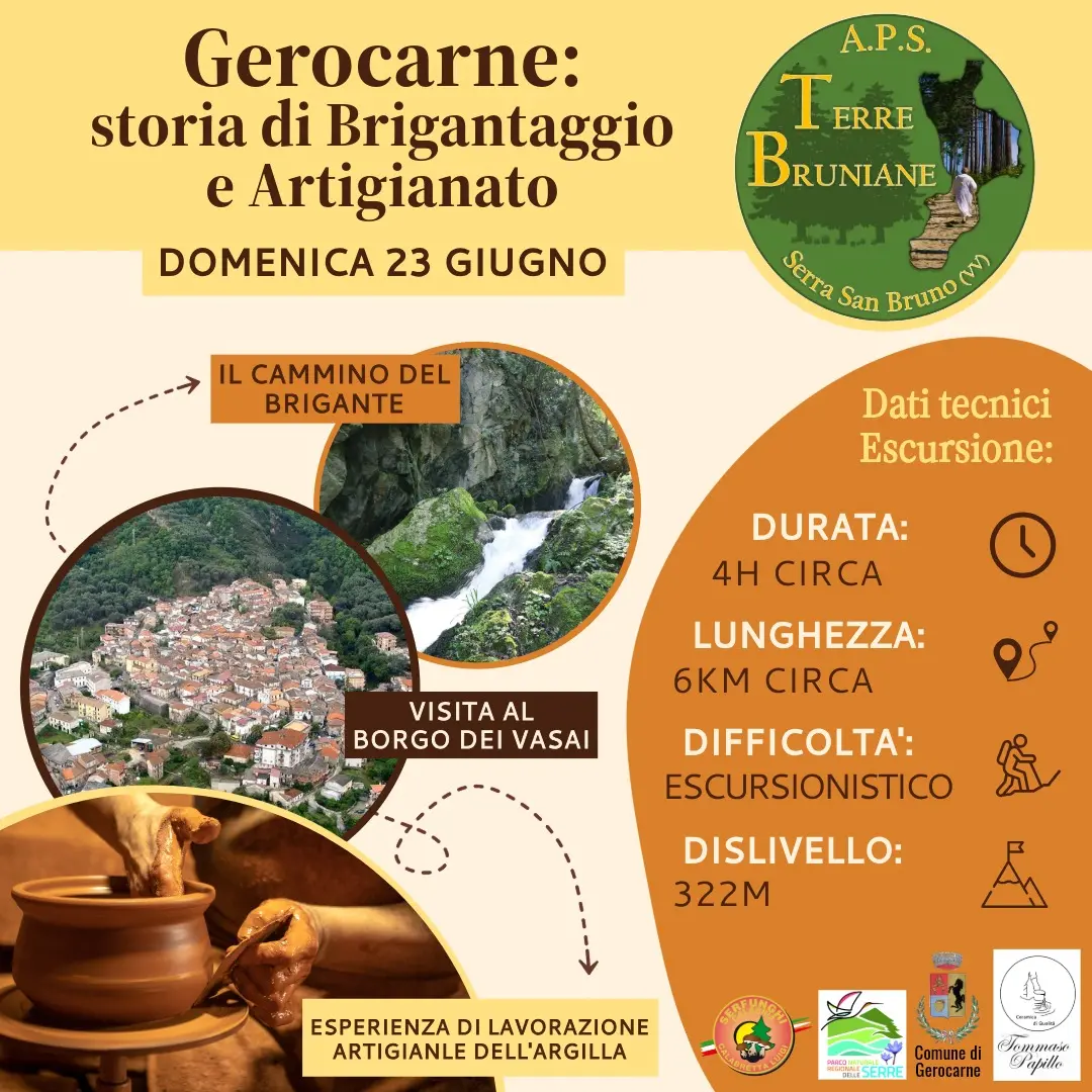 I partecipanti faranno tappa a Gerocarne, «per percorrere uno dei sentieri de “I cammini del brigante”, il quale attraversa il bosco Morano, ricco di lecci e castagni, un tempo animato dalla attività di numerosi carbonai, famoso per aver dato rifugio al brigante Musolino e per la presenza maestosa della Pietra delle Armi. Completato il percorso e dopo un lauto rifocillamento, guidati dal maestro vasaio Tommaso Papillo visiteremo il centro abitato di Gerocarne per giungere al “Quartiere artigiano dei vasai” dove in un’autentica bottega scopriremo quest’arte praticata qui fin dal Cinquecento e ancora tradizione viva nel cuore del Paese».