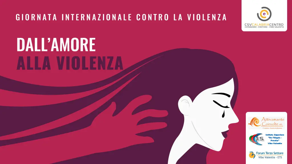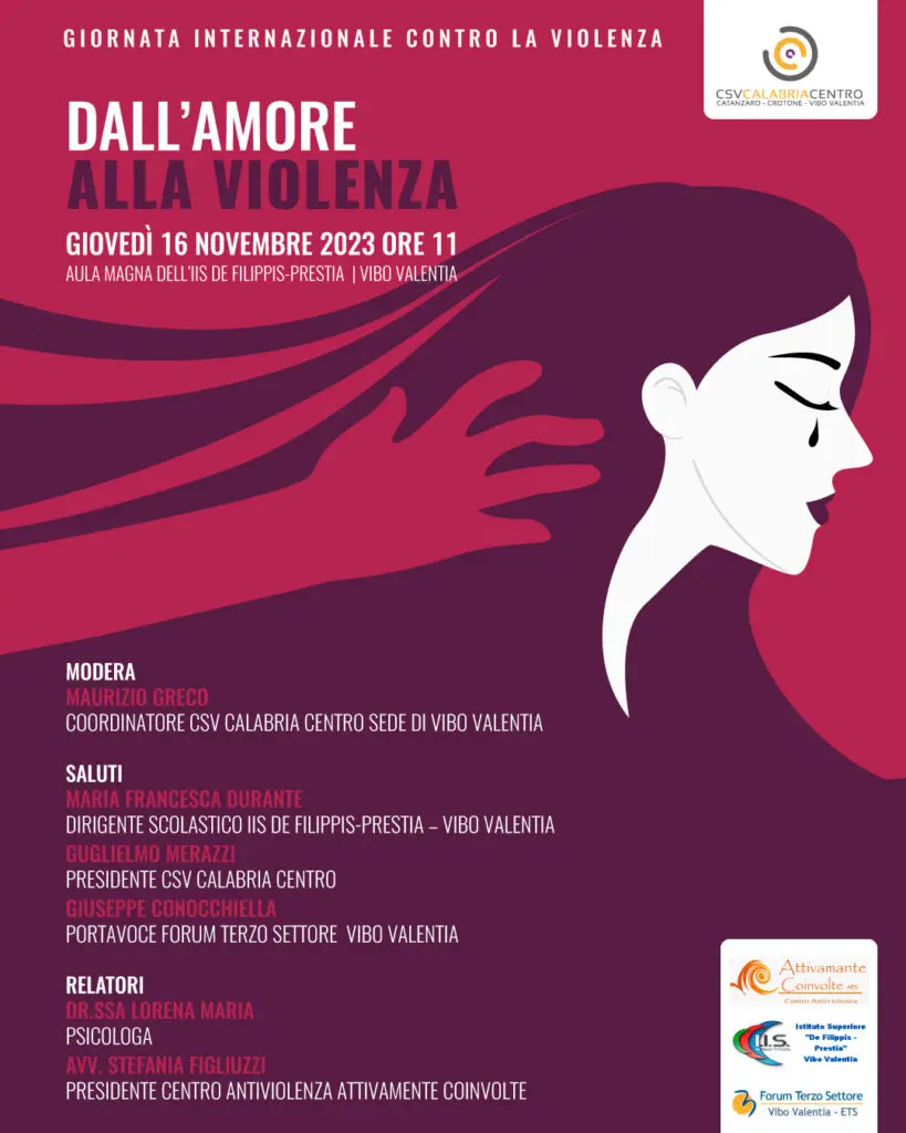 La Giornata internazionale per l’eliminazione della violenza sulle donne è stata istituita dall’Assemblea generale delle Nazioni Unite, attraverso la risoluzione numero 54/134 del 17 dicembre 1999. L’Assemblea generale delle Nazioni Unite ha designato il 25 novembre come data della ricorrenza. In preparazione dell’evento, l’Associazione di promozione sociale “Attivamente Coinvolte”, in collaborazione con il CSV Calabria Centro, Il Forum Terzo Settore della provincia di Vibo Valentia e l’Istituto Superiore “De Filippis – Prestia” di Vibo Valentia, ha organizzato per gli studenti, giovedì 16 novembre 2023, alle ore 11:00, nell’aula magna dell’Istituto Superiore, un incontro di sensibilizzazione sul tema, dal titolo: “Dall’Amore alla Violenza”. Saranno relatori dell’evento la dottoressa Lorena Maria – psicologa e l’avvocato Stefania Figliuzzi – presidente dell’Associazione di Promozione Sociale “Attivamente Coinvolte”. Porteranno i loro saluti Maria Francesca Durante – dirigente scolastico dell’IIPS De Filippis – Prestia di Vibo Valentia, Guglielmo Merazzi – presidente del CSV Calabria Centro, Giuseppe Conocchiella – portavoce del Forum TS di Vibo Valentia. Moderatore dell’evento sarà Maurizio Greco – coordinatore della sede di Vibo Valentia del CSV Calabria Centro.