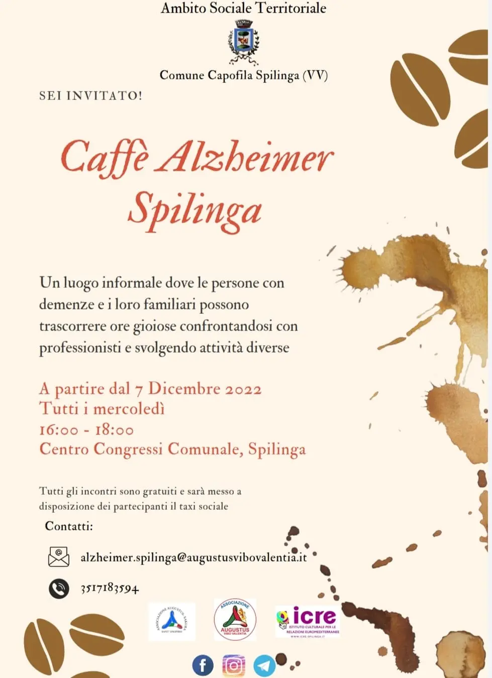Un luogo dove confrontarsi sulle tematiche relative all’Alzheimer e malattie neurodegenerative. Uno spazio dove realizzare incontri informali ma strutturati rivolti al paziente, ai familiari o caregiver. Strumenti utili, in sintesi, che integrano i servizi pensati a queste categorie fragili. Su tali presupposti, domenica 20 novembre alle ore 10.30, a Spilinga si terrà la giornata di inaugurazione del servizio Caffè Alzheimer. Il progetto è frutto della sinergia messa in atto dal Comune di Spilinga, capofila dell’Ambito sociale territoriale n. 3, e le Associazioni Prociv Augustus Vibo Valentia – Icre Istituto culturale per le relazioni euromediterranee – Augustus Sakura Sant’Onofrio. [Continua in basso]