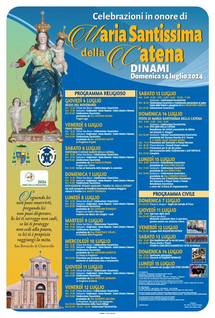 «La devozione nei riguardi della Madonna della Catena è molto sentita a Dinami e non solo. Ogni anno accogliamo, in tre giorni, circa 10mila fedeli. Vengono a piedi, in bici, a cavallo, in auto, con gli autobus». Don Rocco è immerso nei preparativi per i festeggiamenti che, nel piccolo centro dell’entroterra vibonese, si concluderanno il 14 luglio al termine di intense giornate di preghiera. Festeggiamenti che animano per settimane il paese e mobilitano decine di comunità vicine e lontane.