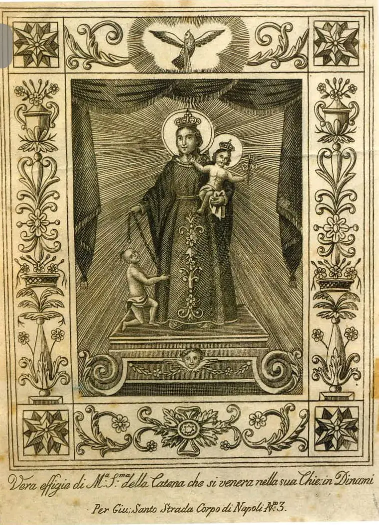Ma come nasce e come si è sviluppato il culto a Dinami? Le radici sono antiche e, negli ultimi anni, è stato possibile ricostruire tasselli di storia e identità locale. Don Rocco entra nel dettaglio: «Fino a qualche tempo fa si pensava che la devozione verso la Madonna con il titolo della Catena facesse riferimento ad un evento miracoloso avvenuto intorno al 1300 a Palermo. Qui, secondo i racconti, un gruppo di schiavi condannati a morte si ripararono in una chiesa. Cercavano rifugio da un temporale. Il gruppo iniziò a pregare ardentemente la Madonna delle Grazie, cui la chiesa era dedicata, e vennero liberati dalle catene. L’eco del prodigio raggiunse ogni angolo della Sicilia per poi diffondersi nel Regno delle Due Sicilie e quindi in Calabria».