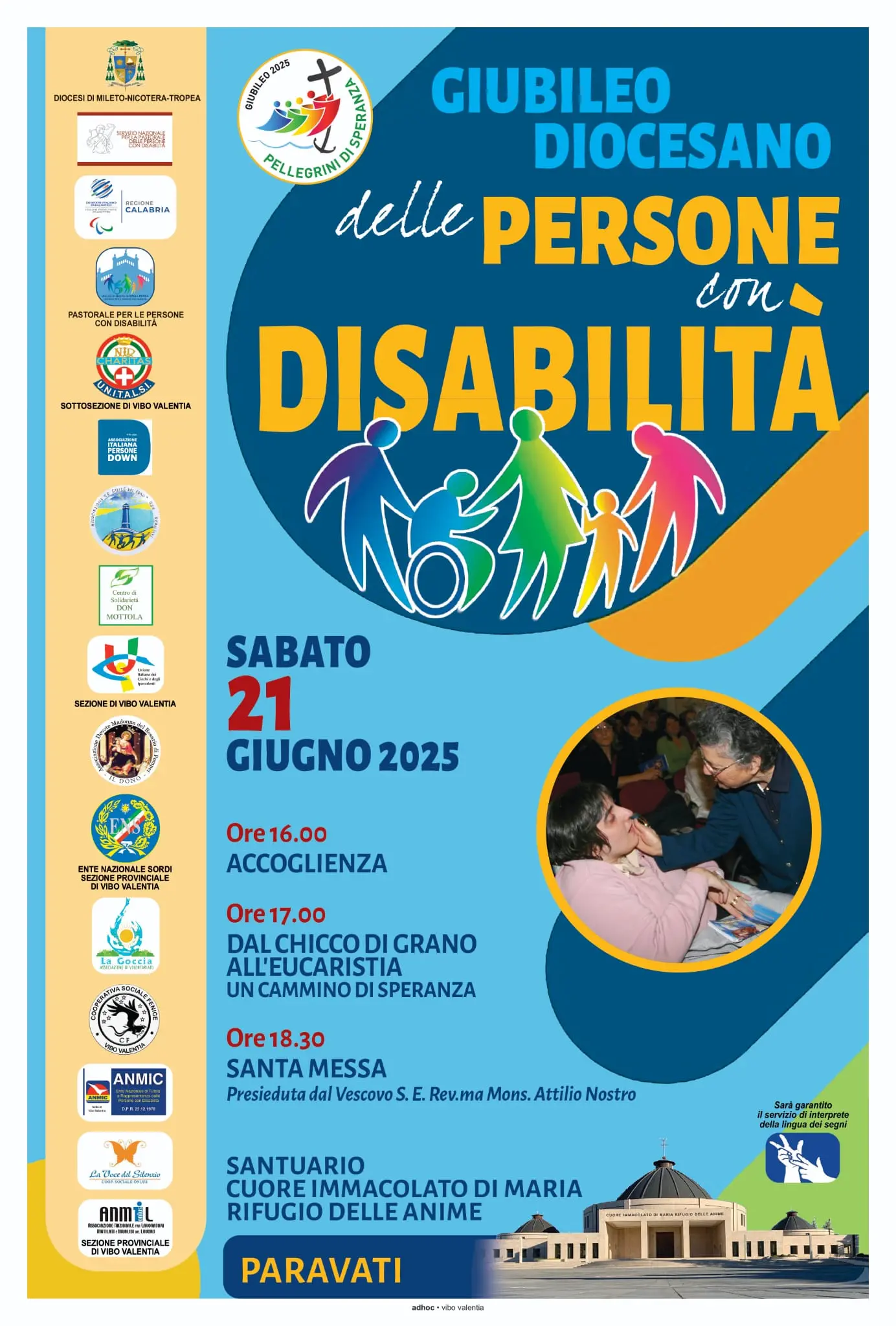 Dopo il Giubileo diocesano dello Sport, celebrato domenica scorsa a Vibo Marina, ecco quello dedicato alle persone con Disabilità. Il tutto in perfetta sintonia con il calendario di eventi programmato nell’ambito del Giubileo della Chiesa universale aperto il 24 dicembre 2024 dal compianto Papa Francesco. L’appuntamento, in questo caso, è per sabato 21 giugno, all’interno del santuario “Cuore Immacolato di Maria Rifugio delle Anime” di Paravati, fulcro della realtà religioso-socio-assistenziale “Villa della Gioia”, sorta anni fa per espressa volontà della Serva di Dio Natuzza Evolo. Il Giubileo diocesano delle Persone con Disabilità prenderà il via alle 16 con l’accoglienza dei partecipanti. Alle 17 è previsto l’incontro: “Dal chicco di grano all’Eucaristia. Un cammino di speranza”, speciale Catechesi dei Cinque Sensi che guiderà i fedeli presenti attraverso un’esperienza sensoriale e spirituale legata al percorso del pane – dalla spiga alla farina, dal profumo al sapore – con riferimenti al Vangelo che coinvolgono tatto, olfatto, gusto, udito e vista. Il Giubileo delle Persone con Disabilità della diocesi di Mileto-Nicotera-Tropea proseguirà alle 18 con la processione e la benedizione eucaristica e alle 18.30 con la Santa Messa presieduta dal vescovo, monsignor Attilio Nostro.