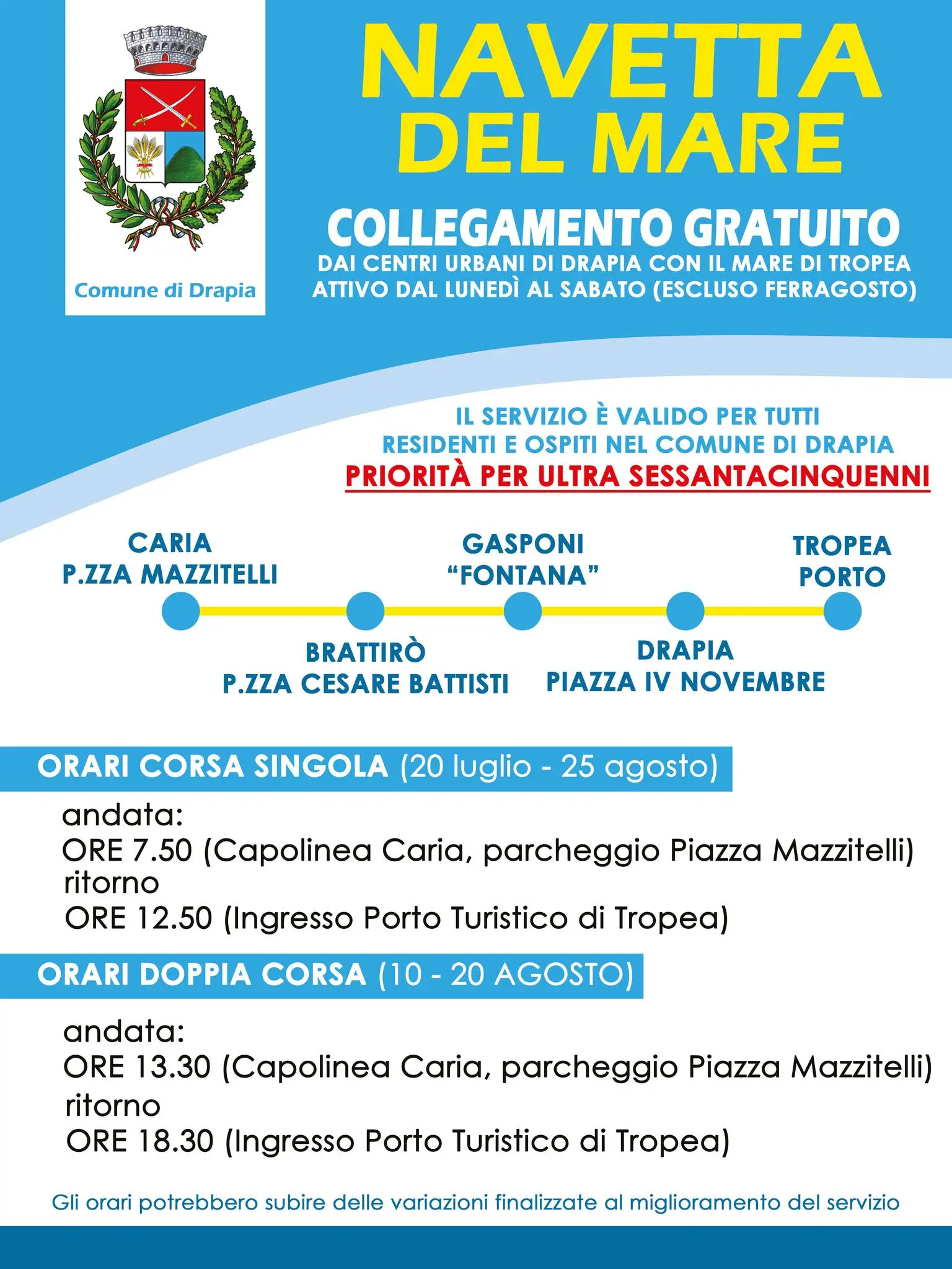 L’amministrazione comunale di Drapia ha approvato la navetta mare per la stagione estiva 2024. Il servizio, gratuito per residenti e turisti, prioritario per gli ultra sessantacinquenni, sarà attivo per 30 giorni consecutivi, a partire da sabato 20 luglio fino a domenica 25 agosto (escluse le domeniche e Ferragosto). «Siamo felici di poter riproporre anche quest’anno il servizio navetta mare, che ha avuto un grande successo nelle passate edizioni – ha dichiarato il sindaco Alessandro Porcelli -. Si tratta di un’iniziativa importante per promuovere il turismo e la mobilità sostenibile, oltre che per offrire un servizio utile ai nostri cittadini, in particolare agli anziani e a chi ha difficoltà a spostarsi autonomamente».