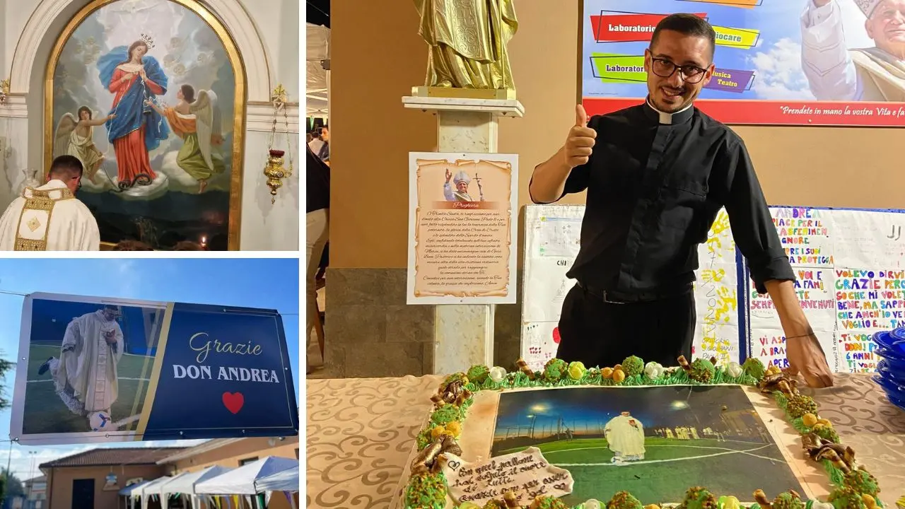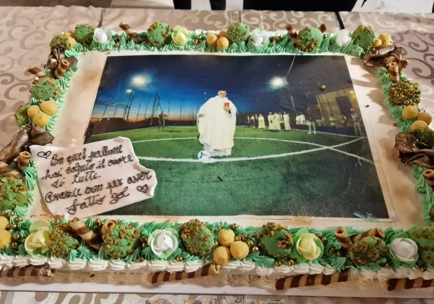 Quindi l’augurio per il nuovo percorso: «Auguriamo a don Andrea un fecondo e proficuo apostolato nelle sue nuove comunità e davvero grazie per l’amore incondizionato che ci hai regolato in questi indimenticabili anni. Quella di ieri sera però non è il finale di una storia triste, ma la degna conclusione di un percorso avviato da un parroco che, arrivato in punta di piedi, come si addice alle persone sagge, se ne va con gli onori della gloria come si deve solo a chi ha lasciato un segno indelebile del proprio passaggio e del proprio operato». Sulla torta, una frase che testimonia l’amicizia tra il parroco e Favelloni: «Con quel pallone hai conquistato i nostri cuori. Grazie per aver fatto gol».