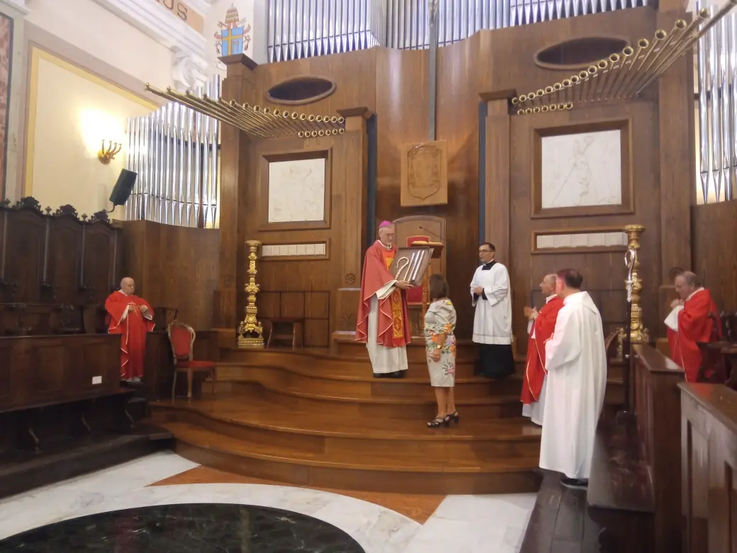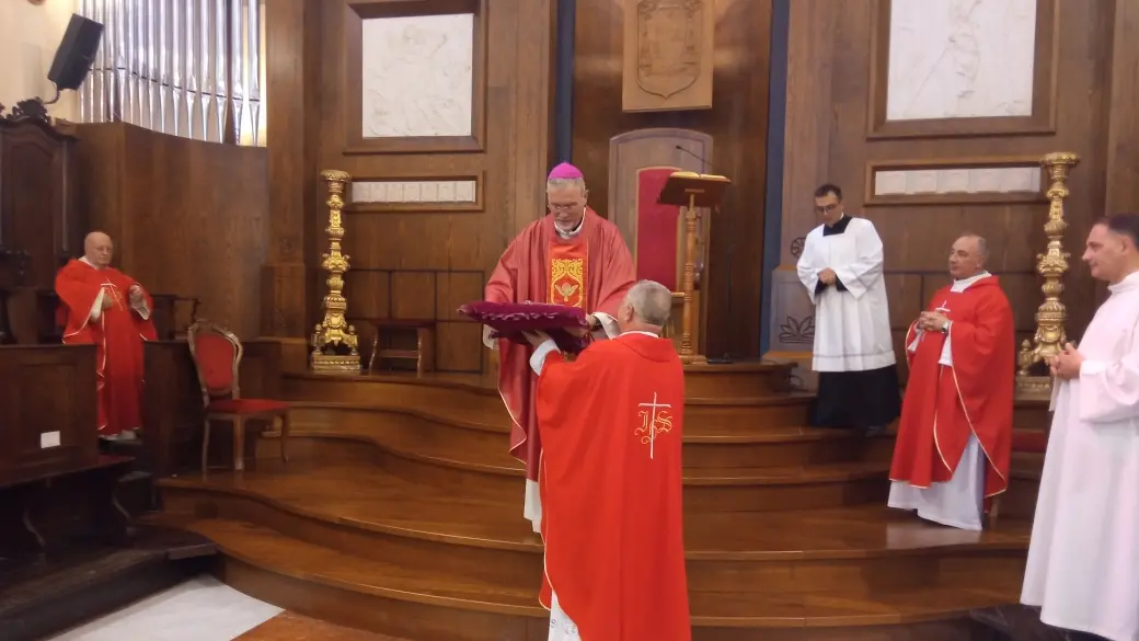 È stata una celebrazione eucaristica “particolare“, quella presieduta dal vescovo monsignor Attilio Nostro nella basilica cattedrale di Mileto, in occasione della festa patronale di San Fortunato Martire. Una messa in cui il presule della diocesi di Mileto-Nicotera-Tropea si è visto recapitare a sorpresa un’opera di Gerardo Sacco e il pastorale restaurato di monsignor Domenico Cortese, alla guida del più antico episcopato di rito latino del meridione d’Italia per circa 30 anni. Un “fuori programma” accolto con grande gioia da monsignor Nostro. A fargli dono della preziosa creazione del maestro orafo, il parroco della chiesa madre della diocesi, don Domenico Dicarlo. A spiegarne il motivo, lo stesso sacerdote, da tempo alle prese con una grave malattia, affrontata con grande fede e dando prova di profondo senso di affidamento a Dio creatore. [Continua in basso]