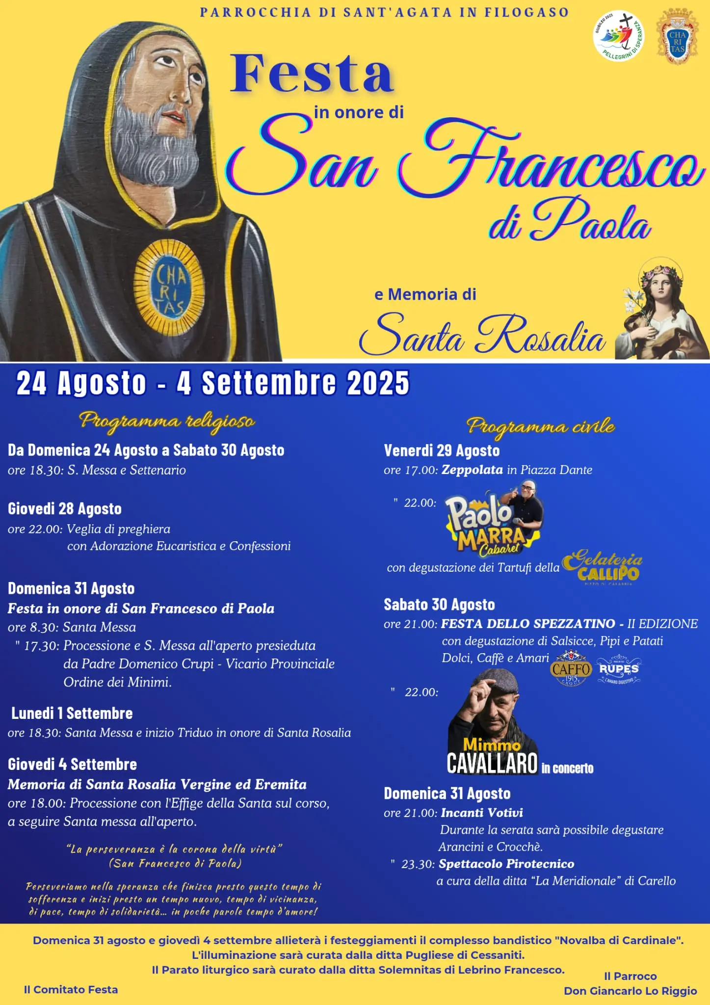 Filogaso si prepara a vivere la festa in onore di San Francesco di Paola, Patrono della Calabria, in un programma che si estende dal 24 agosto al 4 settembre. «La comunità vivrà giornate intense, tra celebrazioni religiose e appuntamenti civili che richiamano fedeli e visitatori da tutta la provincia e non solo», afferma il Comitato Festa guidato dal parroco don Giancarlo Lo Riggio.