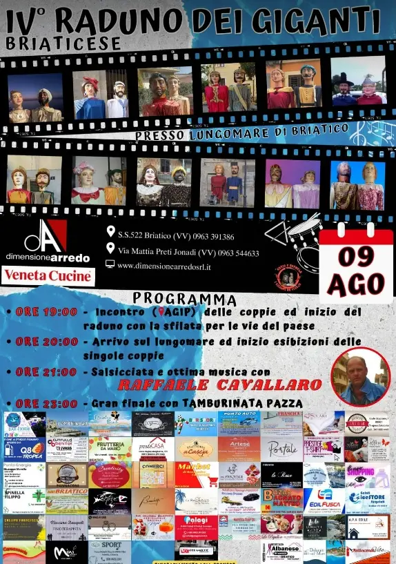 Dodici le coppie partecipanti provenienti da diverse zone del Vibonese e anche fuori provincia (San Cono, Polistena, Paravati, Mesiano, Piana Pugliese per citane alcune) a cui è collegata una folta schiera di tamburi e grancasse. Il raduno briaticese è diventato negli anni un evento di socialità nel pieno dell’estate, quando Briatico moltiplica le sue presenze grazie ai turisti. Il raduno si terrà il 9 agosto. Il punto di ritrovo è presso la stazione di servizio Agip, alle ore 19.00. Da qui il coloratissimo corteo si snoderà per le vie del paese prima di approdare sul lungomare dove si terrà l’esibizione delle singole coppie. Alle 21.00 momento di convivialità con salsicciata e la musica di Raffaele Cavallaro. A conclusione, alle ore 23.00, gran finale con tamburinata pazza. L’organizzazione a cura di Paolo Careglio.