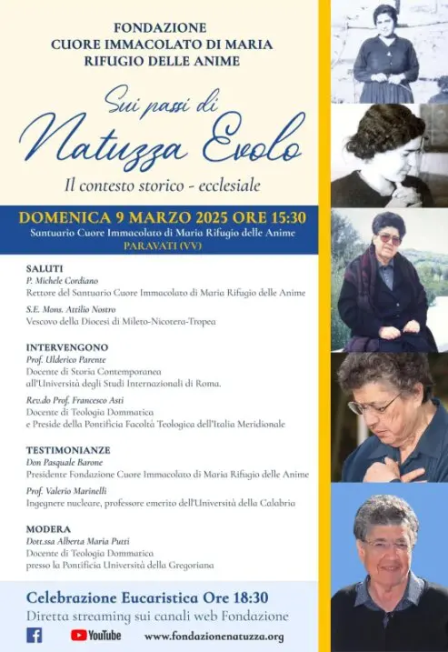Subito dopo ci saranno le testimonianze del presidente della Fondazione, don Pasquale Barone, e dell’ingegnere nucleare, nonché professore emerito dell’Università della Calabria, Valerio Marinelli, quest’ultimo autore di oltre dieci libri che hanno raccontato e che continuano a narrare, ancora oggi, passo passo la vita, i carismi e le virtù di Natuzza Evolo. Modererà l’incontro la docente di Teologia dommatica presso la Pontificia università della Gregoriana di Roma, Alberta Maria Patti. Al termine dell’evento, alle 18.30, all’interno dello stesso santuario è in programma la celebrazione eucaristica che chiuderà la giornata. La messa potrà essere seguita anche in diretta streaming sui canali web della Fondazione intitolata al “Cuore Immacolato di Maria Rifugio delle Anime”.
