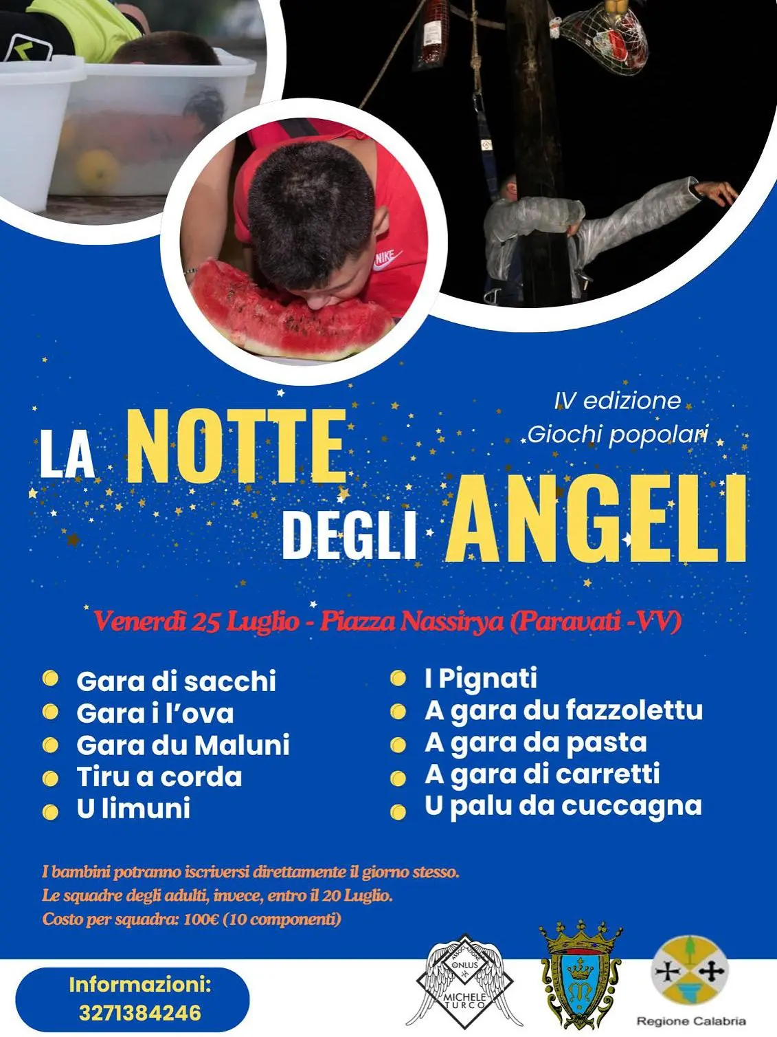 La rassegna proseguirà venerdì 25 luglio nello stesso spazio pubblico con la IV edizione dei giochi popolari “La notte degli angeli”, dedicata a tutti coloro che sono già volati in cielo lasciando questa terra. Nell’occasione i partecipanti si cimenteranno, tra l’altro, nelle gare dei sacchi, delle uova e del cocomero, nel palo della cuccagna e nel tiro della corda. La tre giorni di eventi promossa dalla “Michele Turco” si concluderà sabato 26 luglio con la prima edizione del Torneo di briscola 500, in programma dalle 15.30 nel piazzale antistante la scuola media di Paravati, e con il successivo spettacolo di animazione serale “Super dance flash live show. Format anni ’80 e ‘90”. Le adesioni alle varie iniziative dovranno pervenire agli organizzatori, nel caso dell’estemporanea di pittura entro e non oltre lunedì 21 luglio, per quanto riguarda “La notte degli angeli” e il torneo di briscola entro e non oltre domenica 20 luglio.