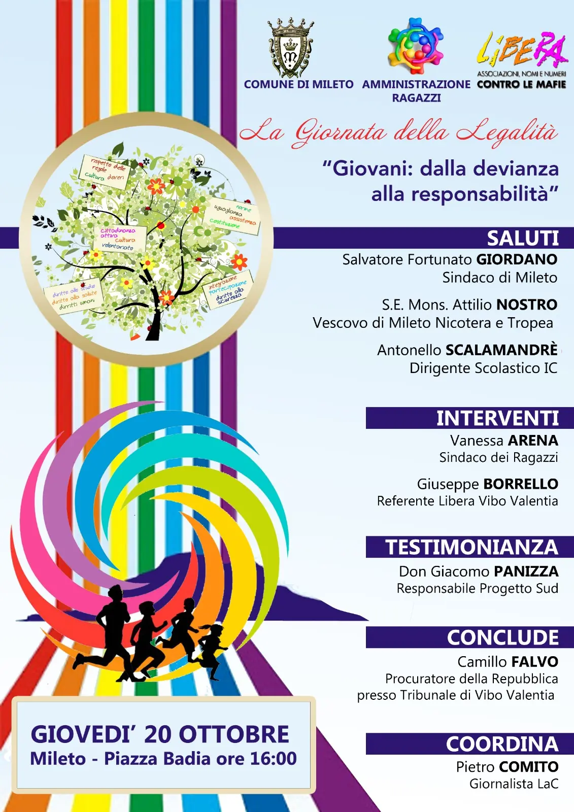 Ritorna a Mileto la “Giornata della Legalità” organizzata annualmente dal Comune, dalla locale Amministrazione dei ragazzi e dall’associazione “Libera”. L’edizione 2022 , tesa a ribadire il proprio no alle mafie, a ogni forma di violenza, sopruso e malaffare, si intitola “Giovani: dalla devianza alla responsabilità” ed è programmata per domani 20 ottobre alle 16 nella centrale piazza Badia. Il programma della manifestazione prevede – dopo i saluti istituzionali del sindaco Salvatore Fortunato Giordano, del vescovo della diocesi di Mileto-Nicotera-Tropea, Monsignor Attilio Nostro, e del dirigente scolastico del locale Istituto comprensivo, Antonello Scalamandrè, gli interventi del sindaco dei ragazzi, Vanessa Arena, e del referente provinciale di Libera, Giuseppe Borrello. Seguiranno, la preziosa testimonianza di don Giuseppe Panizza, responsabile di “Progetto Sud”, e le conclusioni del procuratore della Repubblica presso il Tribunale di Vibo Valentia, Camillo Falvo. I lavori e gli interventi della serata saranno coordinati dal noto giornalista de LaC Tv Pietro Comito. Mancano poche ore, dunque, all’attesa “Giornata della Legalità” organizzata annualmente dall’Amministrazione comunale nella città sede di diocesi. Un evento molto sentito sul territorio, che negli anni è stato organizzato, tra gli altri, alla memoria del giovane Francesco Prestia Lamberti. Il 15enne fu ucciso per futili motivi da un coetaneo, nel maggio del 2017, proprio tra le campagne della cittadina normanna, nello specifico in località “Vindacitu”.