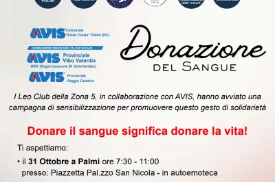I Leo Club della Zona 5 (Palmi, Vibo Valentia, Reggio Calabria e riviera Jonica) scendono in campo per sostenere la donazione del sangue. L’iniziativa, realizzata in collaborazione con le sedi locali dell’Avis, punta a sensibilizzare i cittadini sull’importanza di un gesto semplice ma capace di salvare vite. La prima delle due giornate di raccolta sarà a Palmi, la sede Avis di piazzetta Palazzo San Nicola, dalle ore 7:30 alle 11, dove volontari e cittadini potranno donare in presenza dell’automedica. Domenica 3 novembre, invece, l’appuntamento si sposterà a Vibo Valentia, nei locali dell’Avis di via Piazza d’Armi 25, dalle ore 8 alle 12, sempre con assistenza medica garantita. «Nei prossimi giorni – hanno poi fatto sapere dalla Zona 5 dei Leo Club, attraverso un comunicato stampa – verranno comunicate le date relative ai Leo Club di Reggio Calabria e riviera Jonica, così da coinvolgere l’intero territorio della Zona 5 e favorire una partecipazione diffusa».