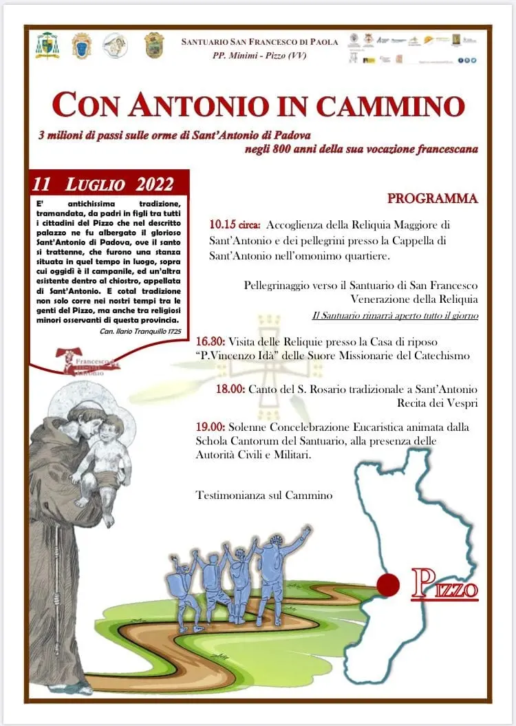 Nella ricorrenza dell’800° anniversario di quel viaggio, un gruppo di pellegrini è partito il 30 giugno dalla spiaggia di Milazzo, luogo del naufragio, per arrivare a Padova domenica 9 ottobre, attraversando tutta l’Italia. Lunedi 11 luglio, il Cammino, i pellegrini e la reliquia maggiore di Sant’Antonio arriveranno a Pizzo dopo ottocento anni dalla data in cui il Santo venne ospitato in città. [Continua in basso]