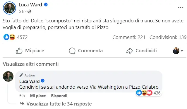 «Sto fatto del Dolce ‘scomposto’ nei ristoranti sta sfuggendo di mano. Se non avete voglia di prepararlo, portateci un tartufo di Pizzo». Una battuta semplice ma capace di raccogliere centinaia di commenti e like. L’ironia dell’attore e doppiatore Luca Ward colpisce ancora. Il poliedrico artista, seguitissimo sui social, riesce con disarmante naturalezza a strappare un sorriso. Tra gli utenti, c’è chi ha raccontato la propria esperienza, chi esaltato il prodotto d’eccellenza simbolo della città napitina. Numerosi gli apprezzamenti per la comicità del doppiatore, noto al pubblico per aver dato la voce italiana a Russell Crowe nel celebre film “Il gladiatore” di Ridley Scott. Ma non solo. Luca Ward è molto attivo nel mondo del cinema, tv e anche in teatro. Ha iniziato in televisione da bambino lavorando in alcuni sceneggiati Rai. Con il suo timbro riconoscibile, ha doppiato anche attori del calibro di Hugh Grant e Antonio Banderas. Ha interpretato il personaggio di Massimo Forti nella soap-opera CentoVetrine e del duca Ottavio Ranieri nella serie tv Elisa di Rivombrosa, in onda su Canale 5. E ancora alla radio ha prestato la voce negli sceneggiati di Radio Due ai personaggi di Sandokan e di Diabolik. Dal 2018, è la voce narrante in “Ulisse, Il piacere della scoperta”, programma documentaristico di Rai 1. Nel film “Il re leone” del 2019, è stato la voce del re Mufasa.