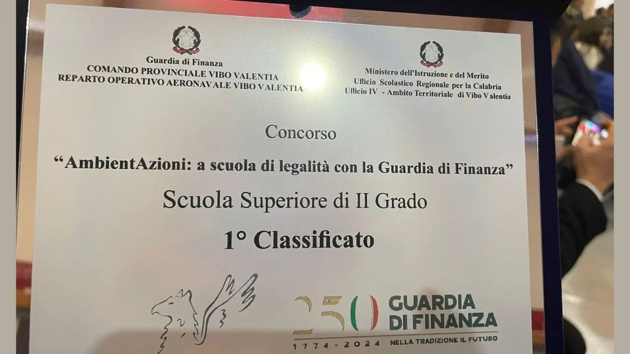 Il liceo Scientifico “Giuseppe Berto” di Vibo Valentia continua a distinguersi per il suo impegno educativo e culturale, ottenendo un importante riconoscimento nell’ambito del concorso “AmbientAzioni: a scuola di legalità con la Guardia di finanza“. «Il concorso – ha fatto sapere in un comunicato stampa ufficiale la docente Carla Castagna, referente alla comunicazione – è stato organizzato in occasione del 250° anniversario della fondazione del Corpo, con l’obiettivo di sensibilizzare i giovani sul valore del patrimonio culturale e sulla necessità di tutelare l’ambiente. Durante la cerimonia di premiazione, che si è svolta al PalaMorelli di Vibo Valentia alla presenza del nuovo prefetto Anna Aurora Colosimo, sono stati premiati gli studenti delle classi III B dell’indirizzo di Scienze applicate e V C dell’indirizzo Ordinario. I vincitori, Francesco Matteo Pizzonia, Gemma Bruzzano, Maria Costanza Petrolo, Pierfrancesco Lazzaro, Carlotta Torcasio e Domenico Polistena, sono stati coordinati dalla docente di scienze Maria Pia Iannazzo».