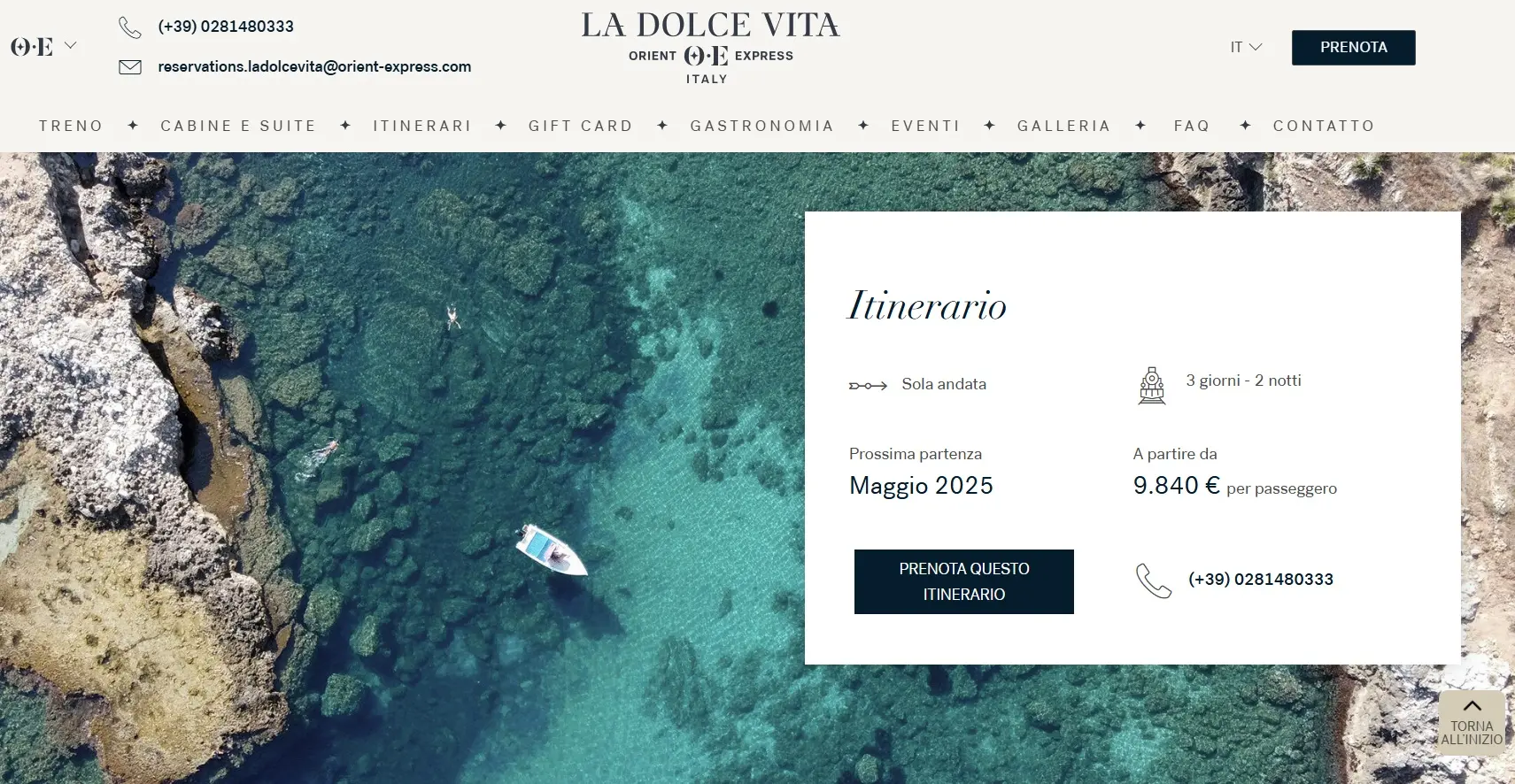 «La Dolce Vita Orient Express è un viaggio straordinario alla scoperta delle meraviglie d’Italia». L’esclusività è il tratto distintivo dei viaggi a bordo del lussuoso e iconico treno. I soggiorni a bordo del maestoso convoglio promettono, come si legge sul sito internet «un viaggio indimenticabile attraverso l’Italia e il suo inconfondibile lifestyle». Venezia e Portofino, la Toscana e i suoi vigneti, poi l’eterno fascino di Roma e ancora direzione Sud con Matera, le coste della Sicilia, l’Etna. Un autentico «viaggio straordinario alla scoperta delle meraviglie d’Italia» accessibile però solo a pochi. “L’ostacolo” principale per i comuni mortali è rappresentato dagli onerosi biglietti con tariffe che oscillano dai 7-8mila euro e che arrivano a sfiorare i 10mila euro a passeggero (3 giorni e 2 notti). Non proprio due spicci, insomma.