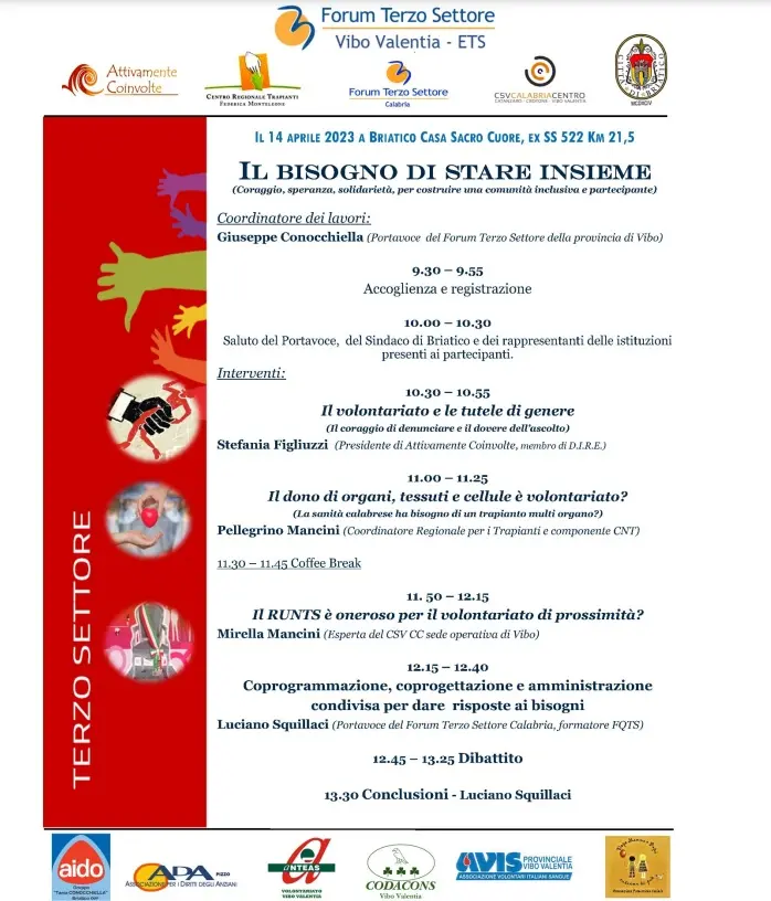 Il 14 aprile il Terzo settore vibonese si ritroverà al casa Sacro cuore di Briatico per parlare di alcune attività sociosanitarie di competenza dello Stato, delle Regioni e delle amministrazioni locali a favore dei portatori di fragilità psico-fisiche e di povertà relativa o assoluta. Attività svolte, spesso, in modo sostitutivo o sussidiario dagli enti del terzo settore esistenti sul territorio più prossimi ai concittadini bisognosi d’aiuto. “Il forum del terzo settore della provincia di Vibo Valentia –evidenzia il portavoce Pino Conocchiella– dal 2015, in collaborazione con il centro di servizio al volontariato territoriale, sta cercando di dare voce unitaria di rappresentanza presso le istituzioni alle Organizzazioni di volontariato (OdV), alle Associazioni di promozione sociale (aps), alle Cooperative sociali, alle fondazioni e agli altri enti del Terzo settore aderenti per un coordinamento e un’azione più efficace nell’interesse generale”. Questo convegno dal tema “Il bisogno di stare insieme” è stato voluto “per focalizzare e rendere noti i valori ideali e umani di un insieme di persone che hanno scelto di dare un po’ di loro (tempo, prestazioni manuali, competenza, conoscenza, ma principalmente amore e ascolto”. [Continua in basso]