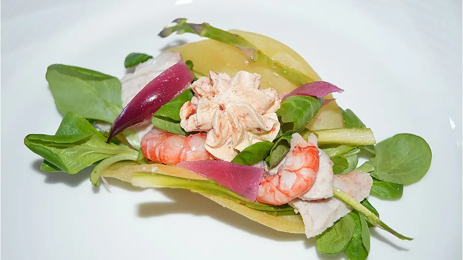 Per la farcitura: 150 gr di ricotta, 50 gr di nduja di spilinga, 200 gr. di pesce spada, 8 gamberi rossi di Capo Vaticano, 4 asparagi freschi, 1 cipolla cotta in acqua acidula, 80 gr di songino, 4 pomodorini tagliati a concassè, olio extra vergine q.b. Preparazione: lavorare la ricotta con la nduja, scottare in padella con un po’ di olio il pesce spada ed i gamberi, condire con il sale e comporre il piatto come da foto.