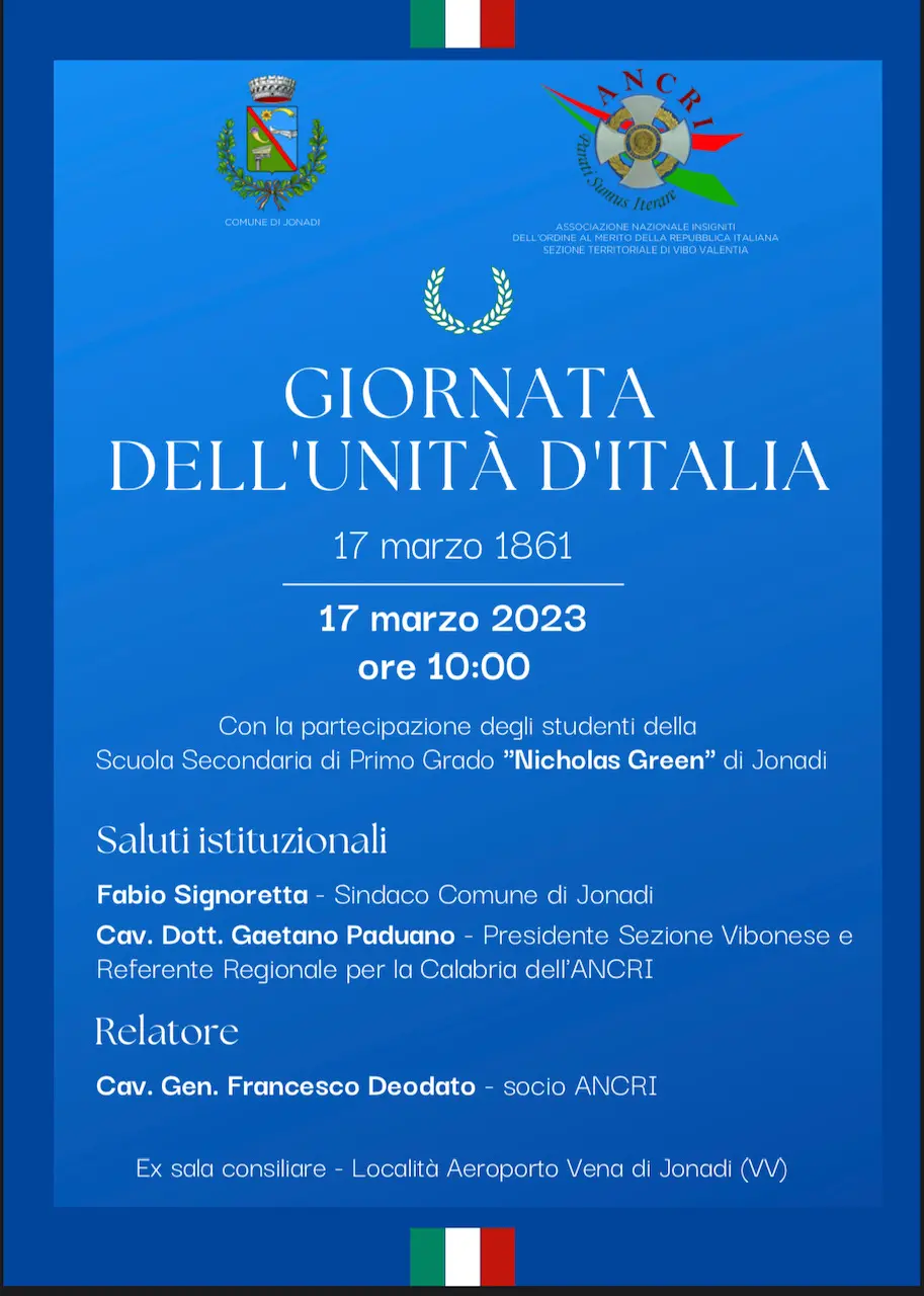 Sezione provinciale dell’Associazione nazionale insigniti dell’Ordine al Merito della Repubblica Italiana (Ancri) e amministrazione comunale di Ionadi, uniti insieme per celebrare nel migliore dei modi l’annuale Giornata dell’Unità d’Italia. L’incontro si svolgerà venerdì 17 marzo, a partire dalle ore 10, nell’ex sala consiliare situata all’interno dell’edificio che ospita la delegazione municipale di Vena di Jonadi. Il programma dell’evento, dopo i saluti istituzionali del sindaco Fabio Signoretta e del presidente provinciale e referente regionale Ancri, Gaetano Paduano, prevede la relazione sul tema del generale Francesco Deodato. All’incontro parteciperanno anche gli studenti della locale scuola secondaria di primo grado “Nicholas Green“, i quali potranno interloquire con gli intervenuti e con altri rappresentanti dell’amministrazione comunale di Ionadi, in particolare sul significato e sull’importanza che ancora oggi riveste la Giornata dell’Unità d’Italia, incentrata a promuovere i principi costituzionali su cui si fonda lo Stato democratico, a sostenere i valori di cittadinanza e a riaffermare e consolidare l’identità nazionale e i suoi simboli. La cerimonia celebrativa in programma a Vena di Ionadi, dunque, dall’alto valore simbolico, sarà un’occasione unica per riflettere sull’importanza della storia della nazione e sulle responsabilità che ogni cittadino ha nel contribuire alla crescita dell’Italia. Al termine dell’incontro, tra l’altro, a tutti gli alunni della locale scuola secondaria sarà donata una copia del volume “Partecipazione della Calabria alla Prima Guerra Mondiale”.