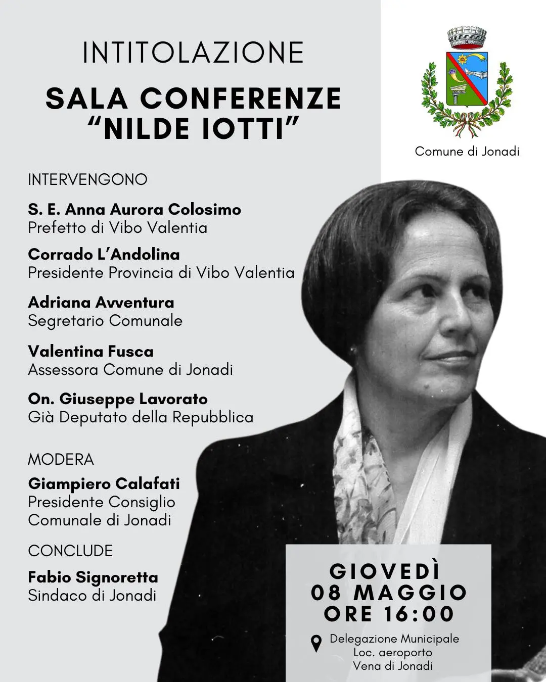«Intitolare questa sala a Nilde Iotti è un gesto di memoria attiva. Significa riaffermare i valori della democrazia, della partecipazione e della responsabilità pubblica in un tempo in cui c’è bisogno di punti fermi. Lo facciamo restituendo alla comunità uno spazio moderno, accessibile, pronto a ospitare la vitalità culturale e civile di Jonadi». Queste le parole con cui il sindaco di Jonadi Fabio Signoretta annuncia la prossima intitolazione della sala conferenze della Delegazione municipale di Vena all’ex presidente della Camera dei Deputati. L’apposita cerimonia è in programma giovedì 8 maggio alle 16. Una scelta non casuale, visto che proprio l’8 maggio del 1948 Nilde Iotti faceva il suo ingresso in Parlamento, dando inizio a una lunga e autorevole esperienza istituzionale. «L’iniziativa – prosegue il primo cittadino – rappresenta un momento di forte valore simbolico, volto a rendere omaggio a una protagonista della vita democratica italiana, il cui impegno continua a essere riferimento per le nuove generazioni. A partire da quella giornata, la sala sarà ufficialmente nuovamente fruibile dalla cittadinanza. Completamente ristrutturata, attrezzata e finalmente adeguata alla sua funzione, diventerà un vero e proprio spazio civico destinato a ospitare iniziative culturali, eventi pubblici, momenti di confronto e meeting istituzionali».